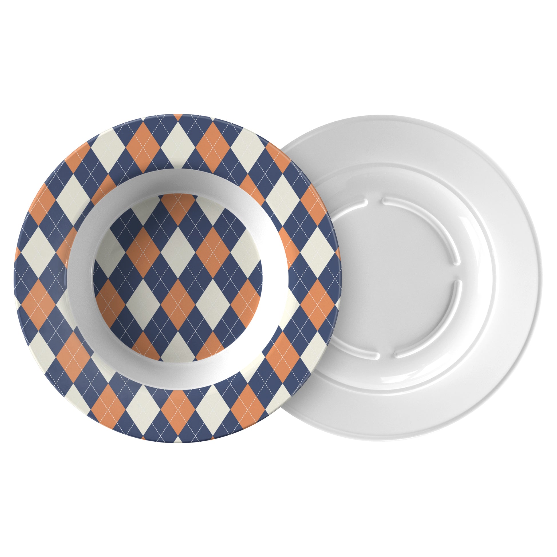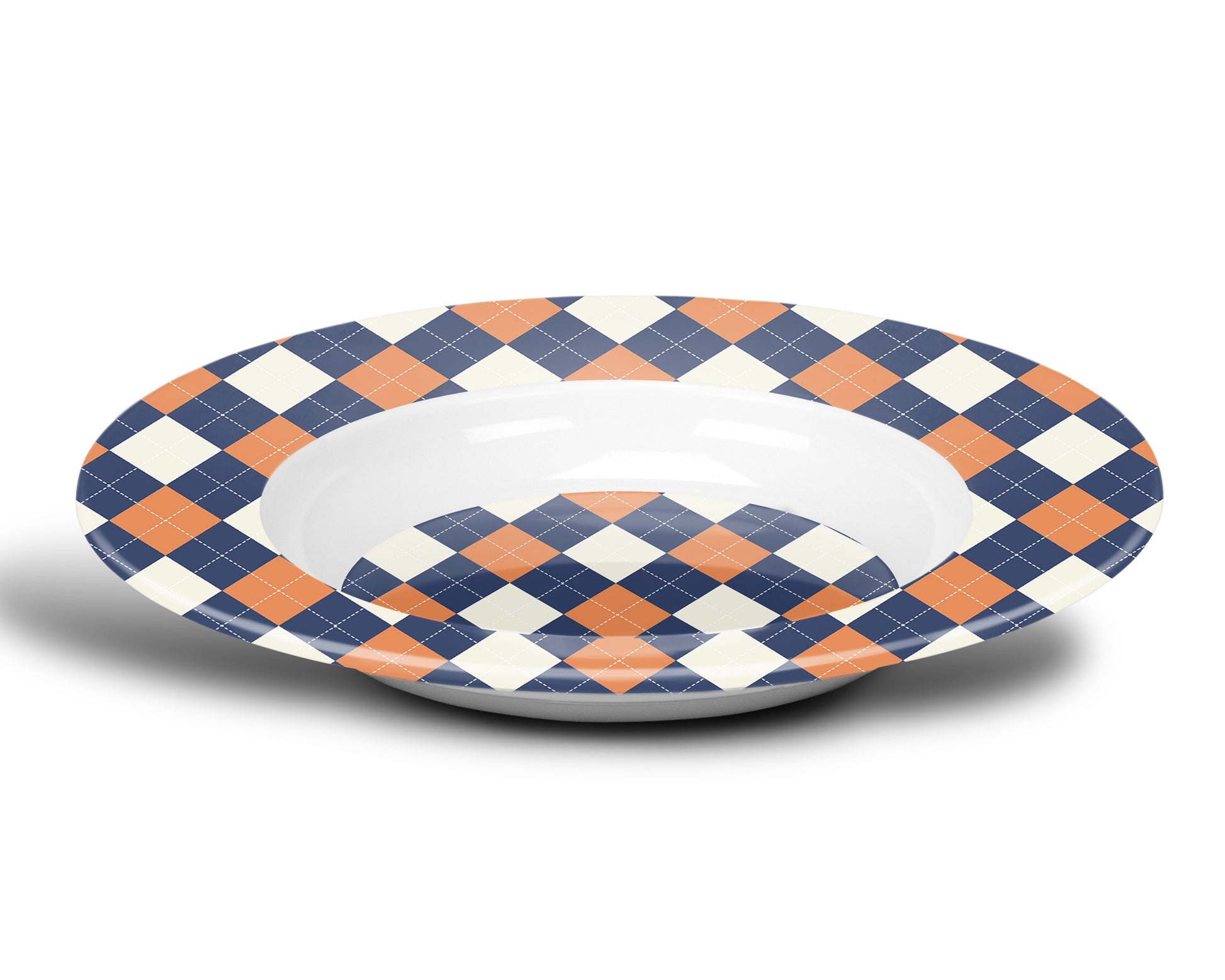 Sold individually or as a Set of FOUR, Rim Soup Bowls featuring navy, orange and cream argyle pattern. These plastic bowls are perfect for enjoying salads, pasta, and soup. Add a touch of sophistication and elegance to your table with these exclusive bowls. Luxury Decoware® plastic bowls are perfect for any occasion, from backyard barbeques to beach picnics. Versatile for both indoor and outdoor use. Food safe plastic dinnerware. Microwave and dishwasher safe for convenience.