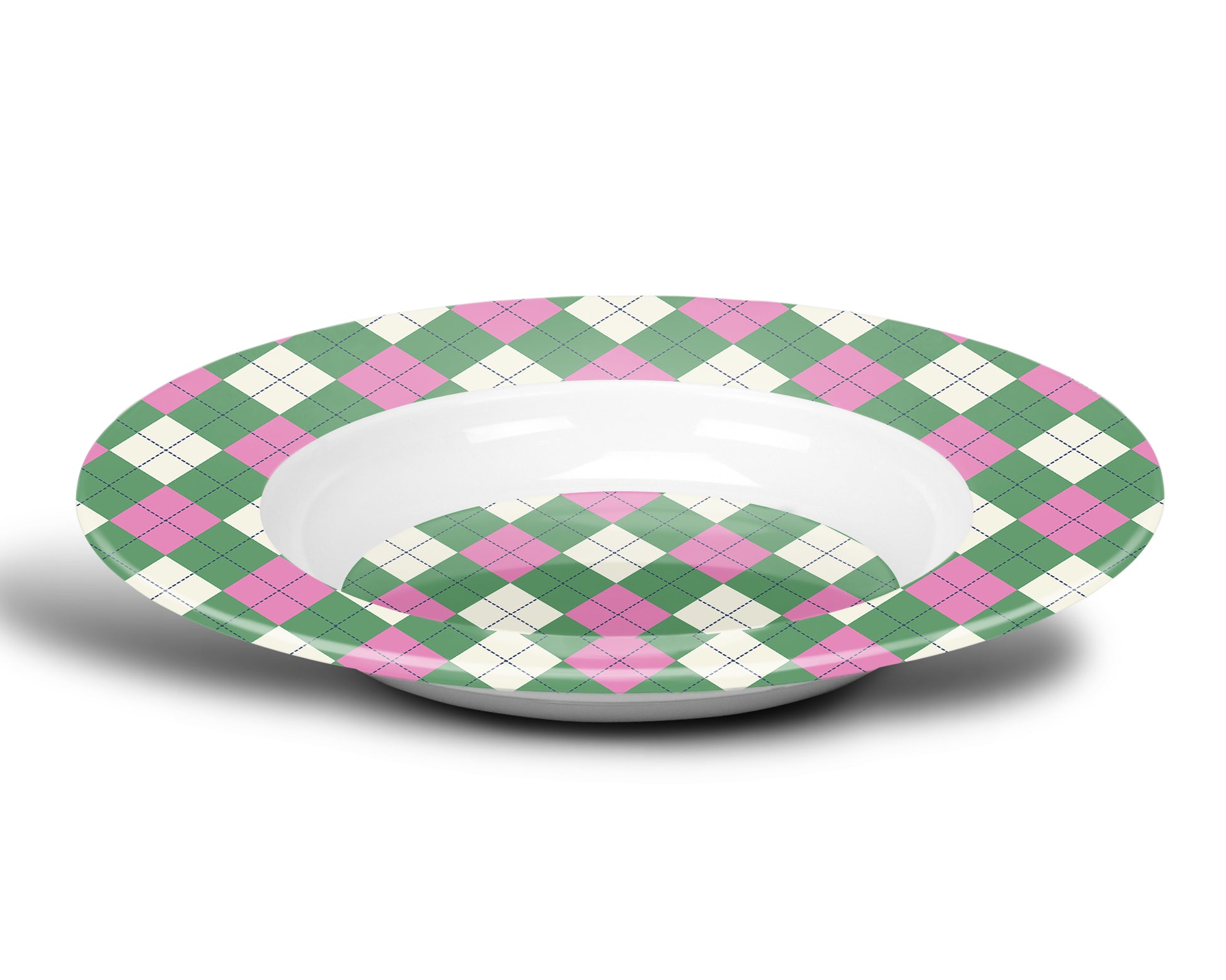 Sold individually or as a Set of FOUR, Rim Soup Bowls featuring pink, green and cream argyle pattern. These plastic bowls are perfect for enjoying salads, pasta, and soup. Add a touch of sophistication and elegance to your table with these exclusive bowls. Luxury Decoware® plastic bowls are perfect for any occasion, from backyard barbeques to beach picnics. Versatile for both indoor and outdoor use. Food safe plastic dinnerware. Microwave and dishwasher safe for convenience.
