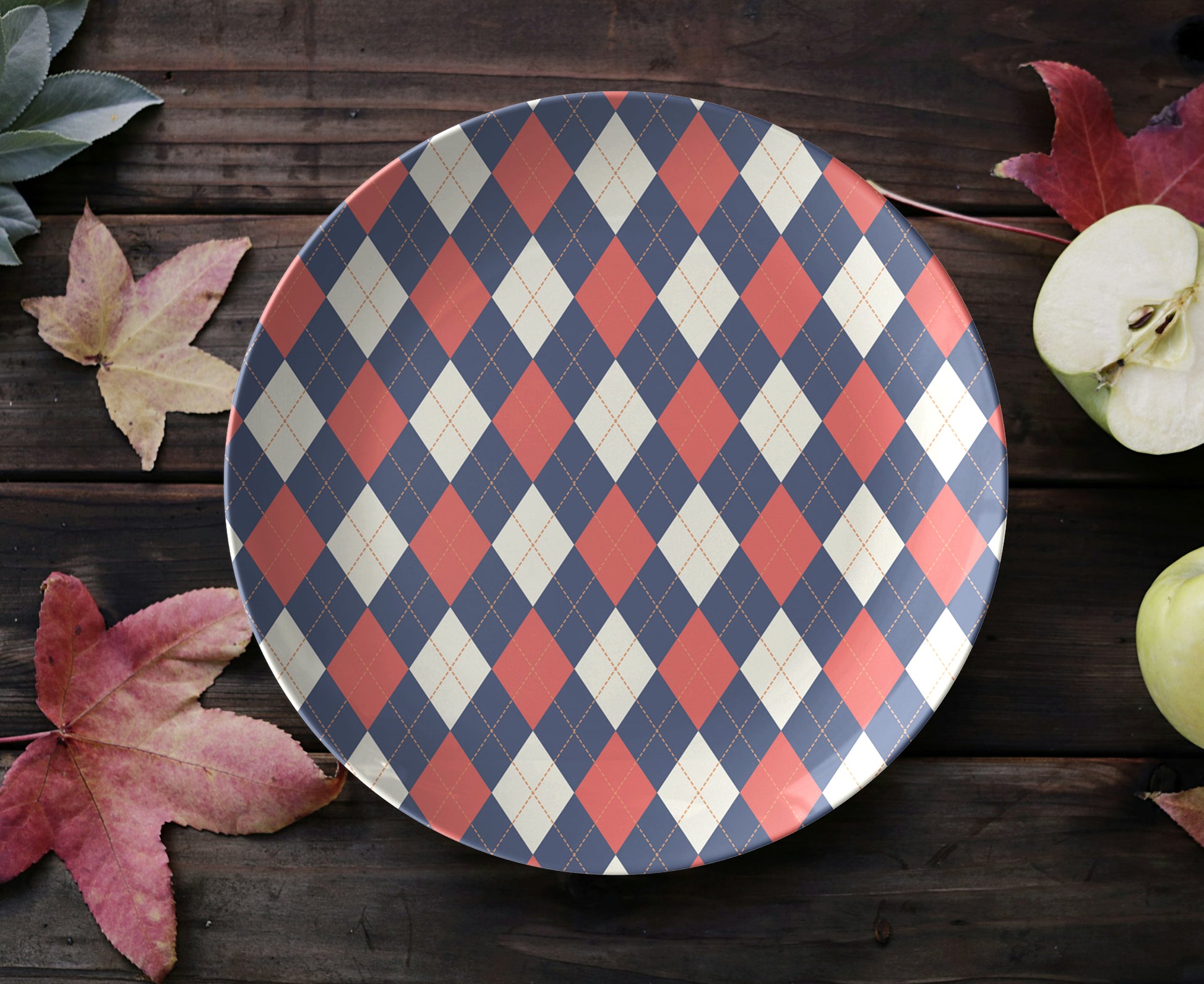Argyle Plate, Navy, Red and Cream, Luxury Plastic, Choose Single or Set of Four