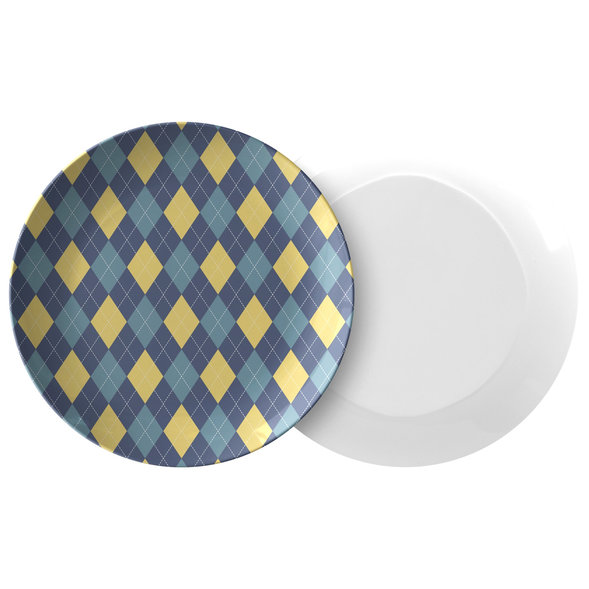 Argyle Plate, Navy, Yellow and Teal, Luxury Plastic, Choose Single or Set of Four
