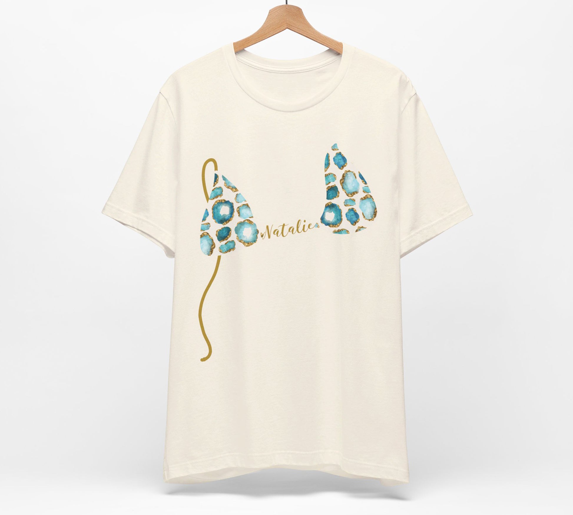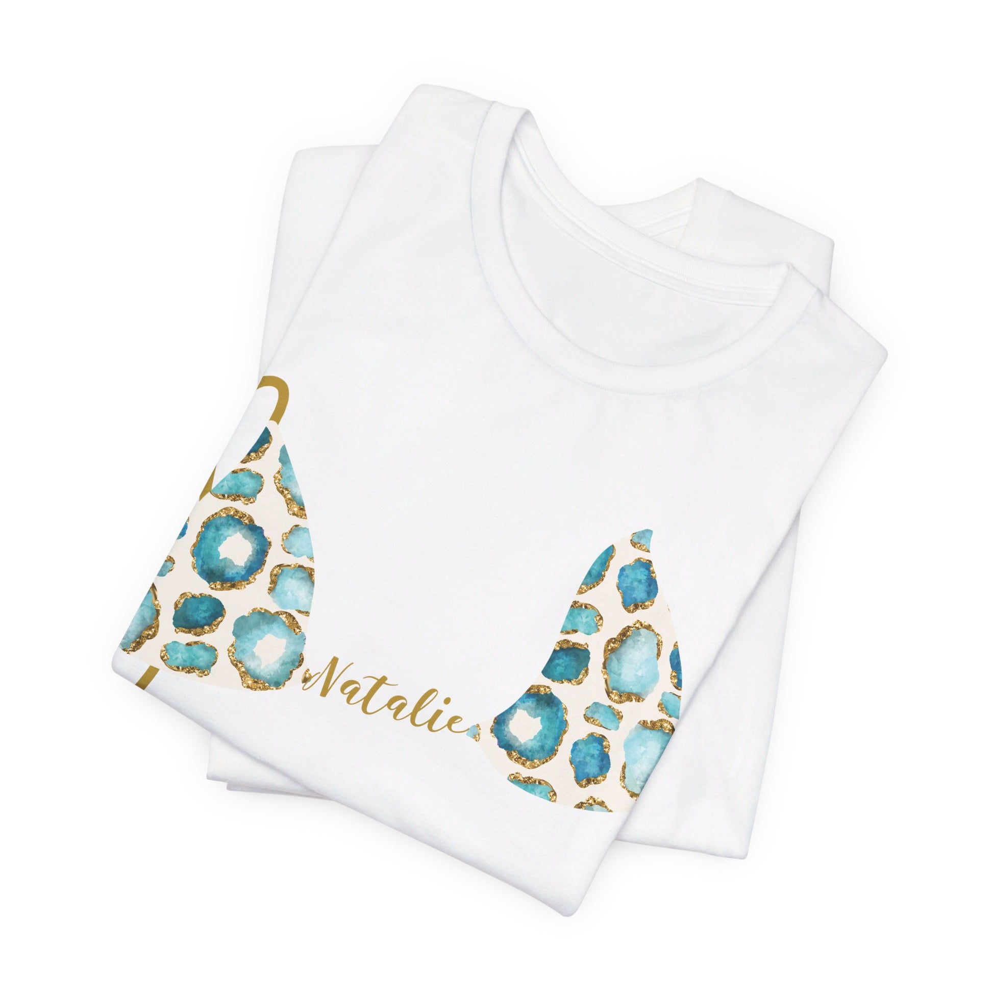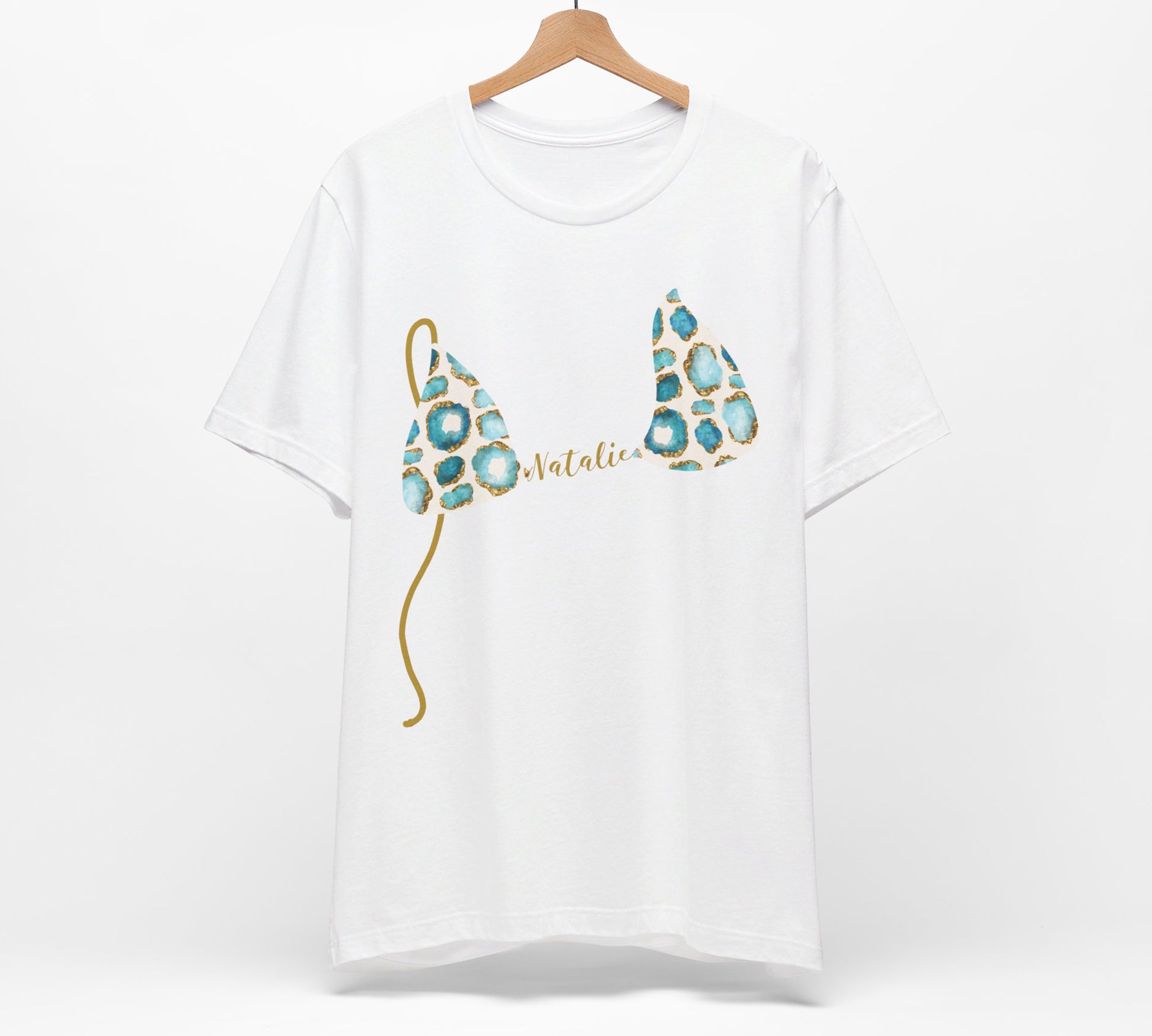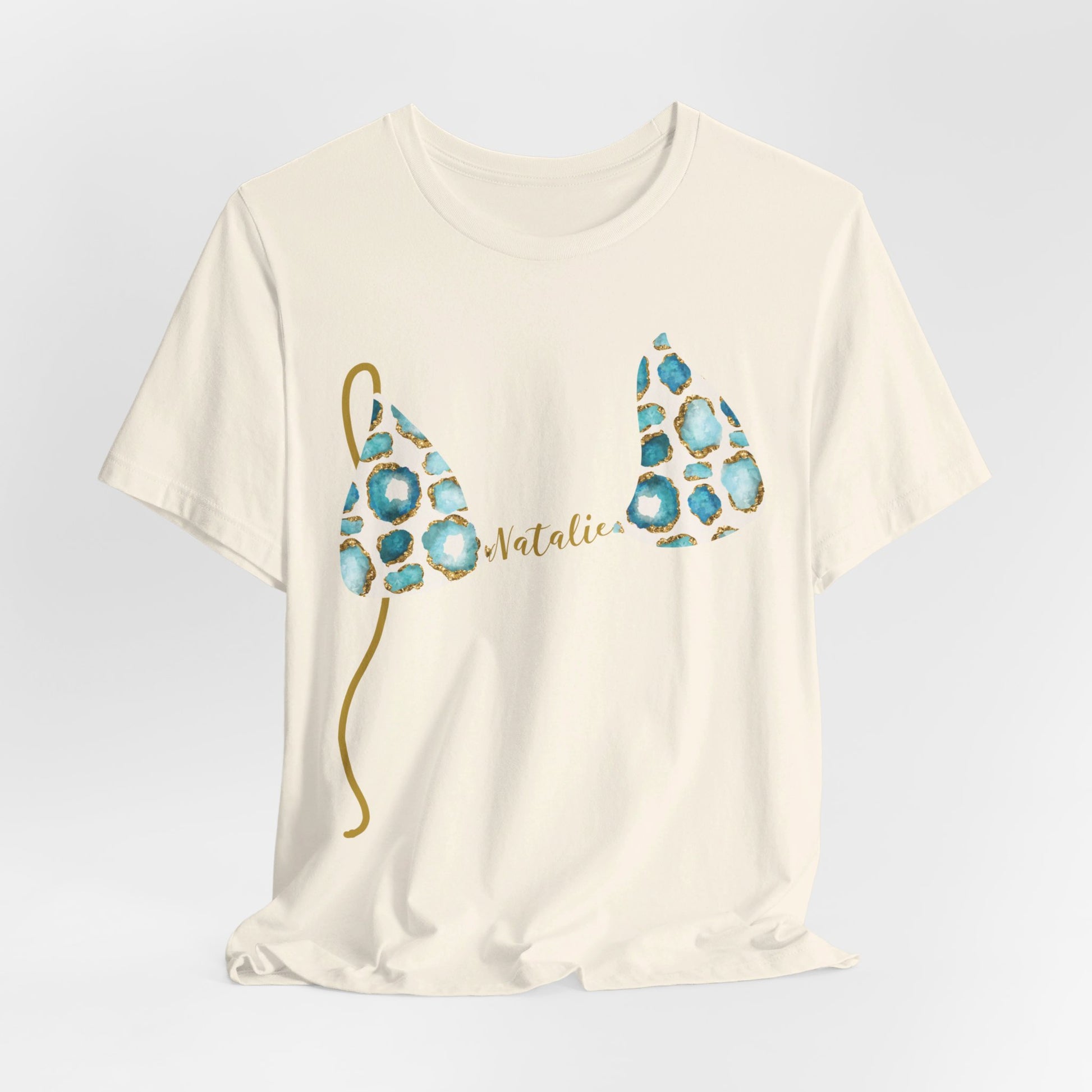 Bikini Top T-Shirt, Aqua & Gold Gemstone Print, Custom Personalization