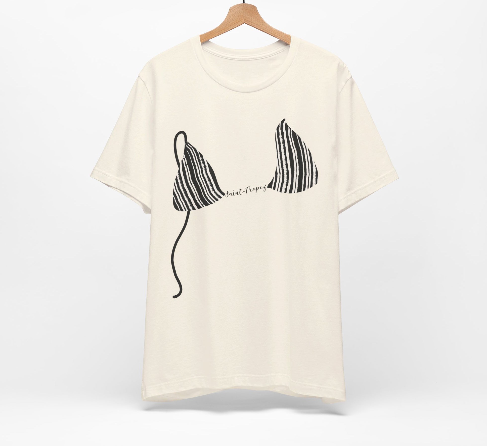 Fun and flirty customizable Black & Ivory Striped Print Bikini Top Print T-Shirt adds a chic beachy vibe to your outfit. This shirt features a print of a playfully-crooked bikini top which appears to be slipping with the string dangling. The graphic includes a space between the bikini cups where you can add a name, place, or text of your choice, creating a unique personalized embellishment that reflects your style. Planning a vacation? Add the country or city name for a chic, destination-inspired look. The possibilities are incredible!