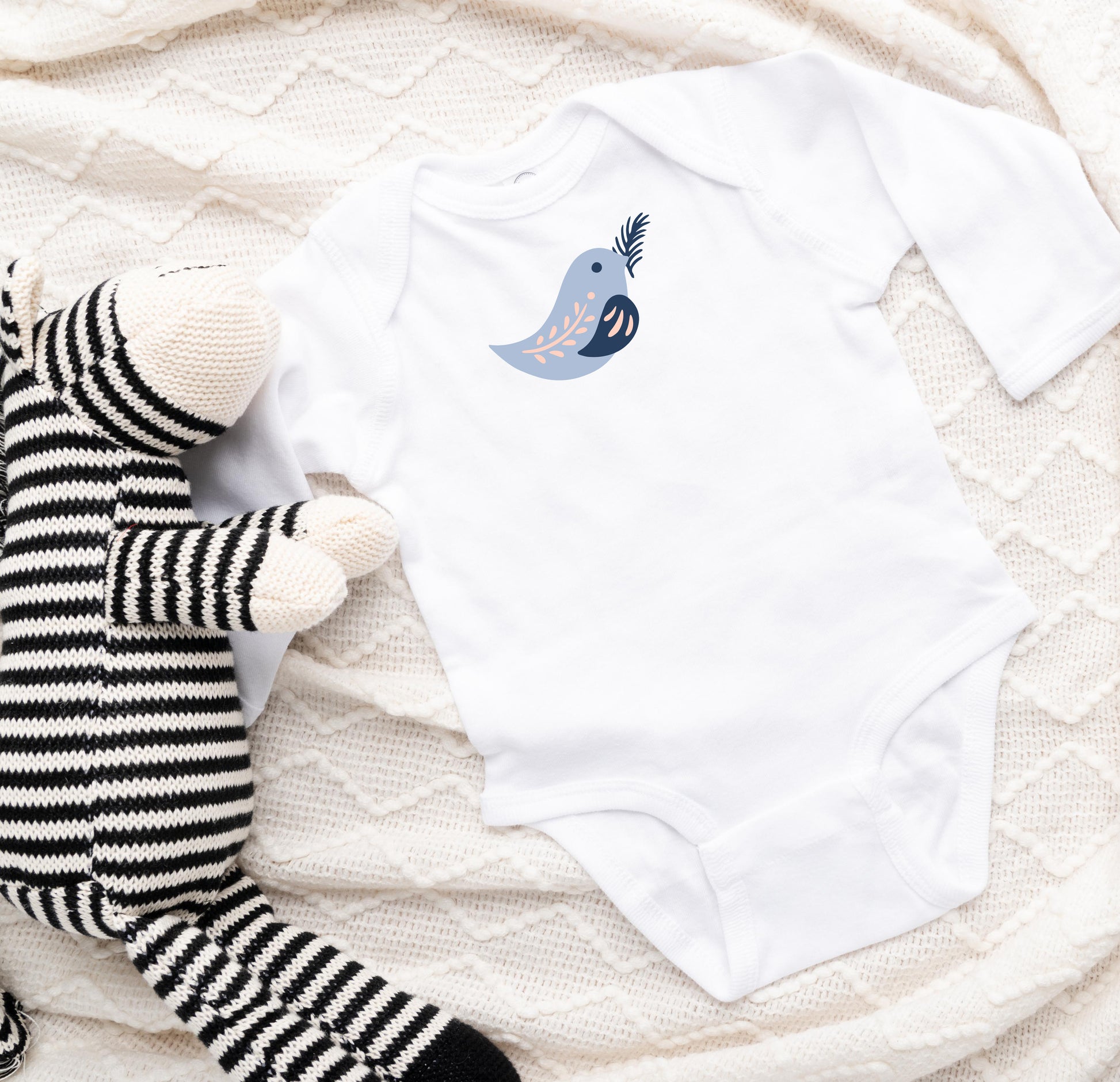 Adorable long sleeved white one piece featuring a folk art printed blue dove makes a cute baby gift. These bodysuits feature lap shoulders to make it easier for the many times a day that parents have to change baby’s outfit.