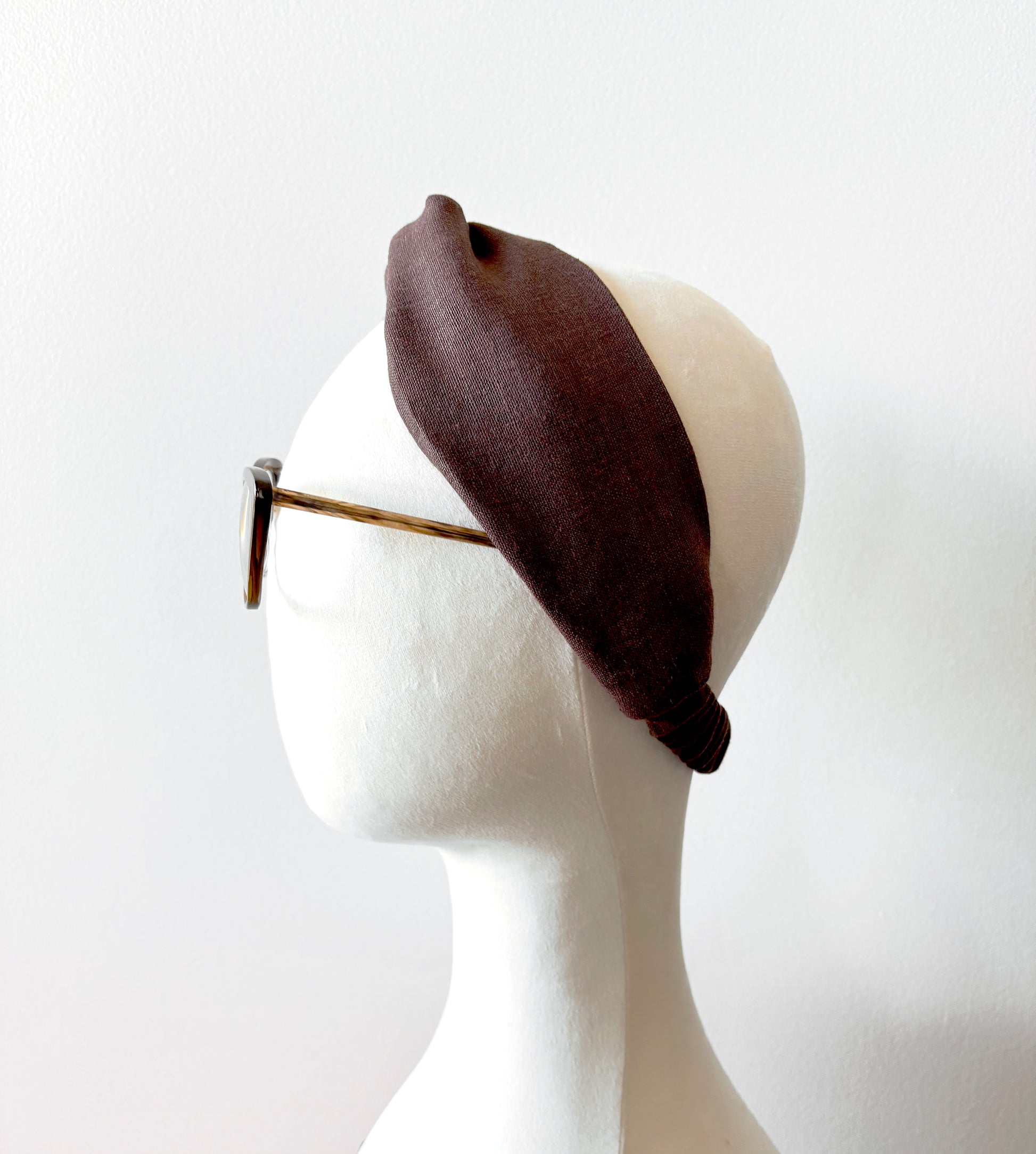 Brown Linen Headband, Twist Top Knot Turban Headband with Elastic