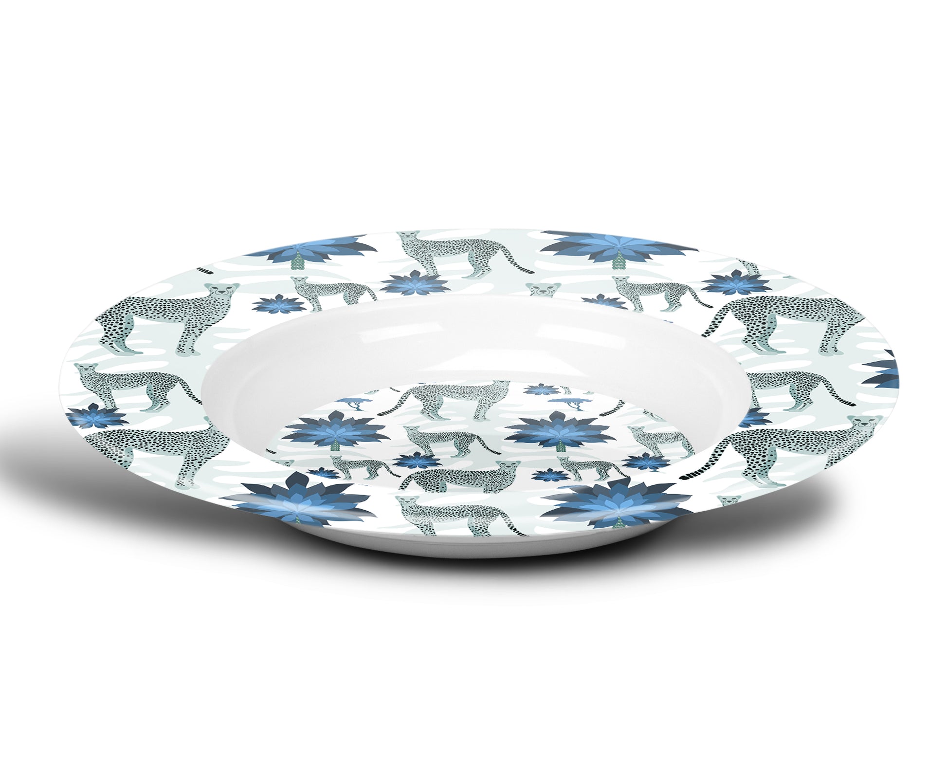 Safari Chic Print Bowl. Made from Thermosaf resin, it's a safer alternative to melamine. Featuring a beautiful safari inspired print with cheetahs and palm trees in blue and white, designed by Alyssa Reuven for Aliza Darik. Our luxury Thermosaf plastic dinnerware is perfect for any occasion, including backyard barbeques and beach picnics. The vibrant design adds a touch of elegance to any setting. Versatile for both indoor and outdoor use. Food safe plastic dinnerware. Microwave and dishwasher safe for convenience.