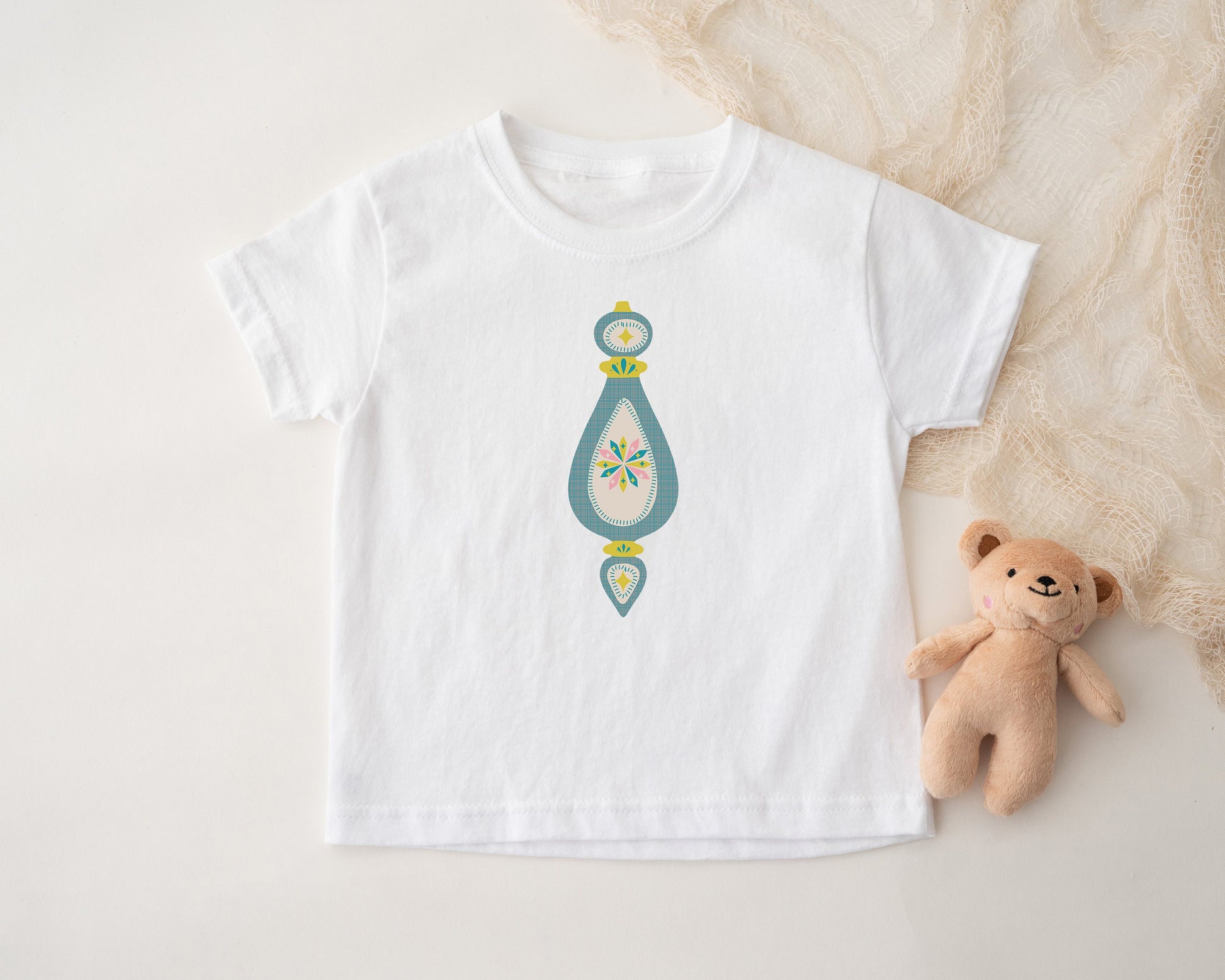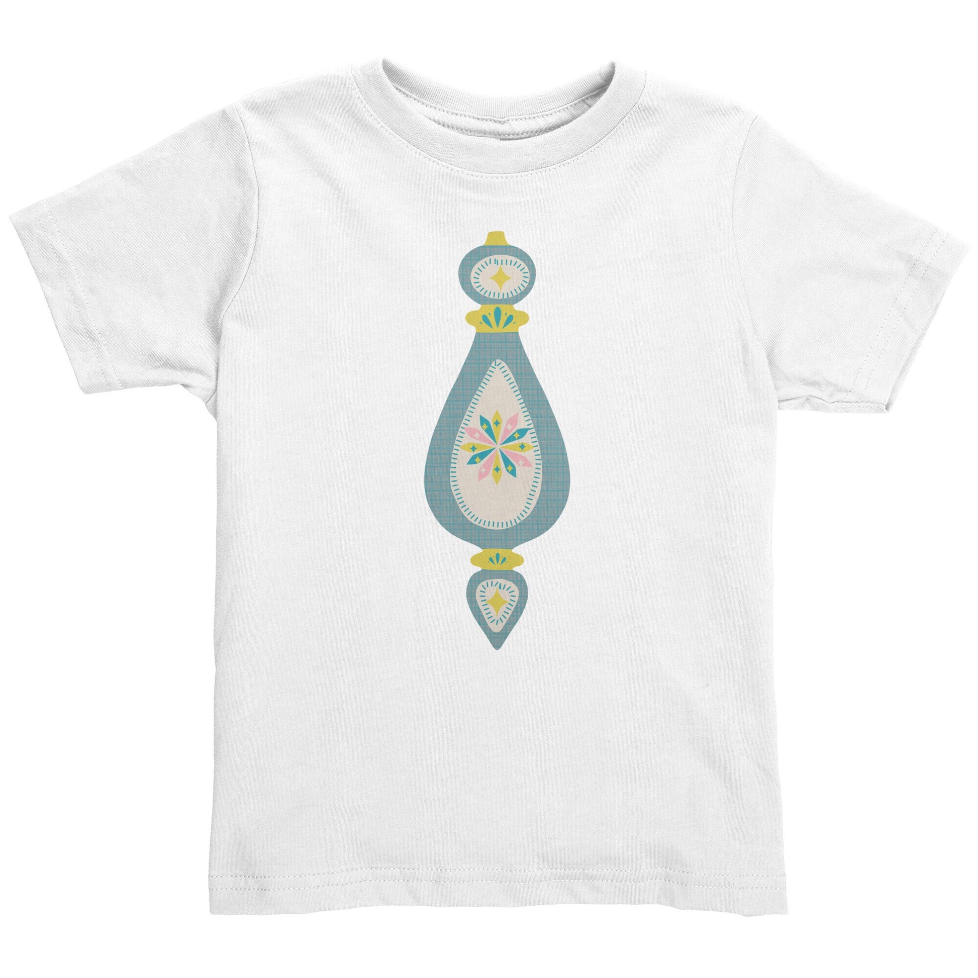 Christmas T-Shirt for Toddler, White with Teal Mid-century Modern Ornament Print