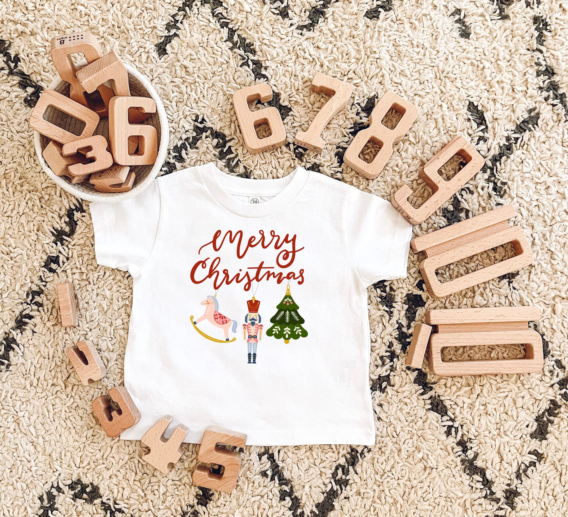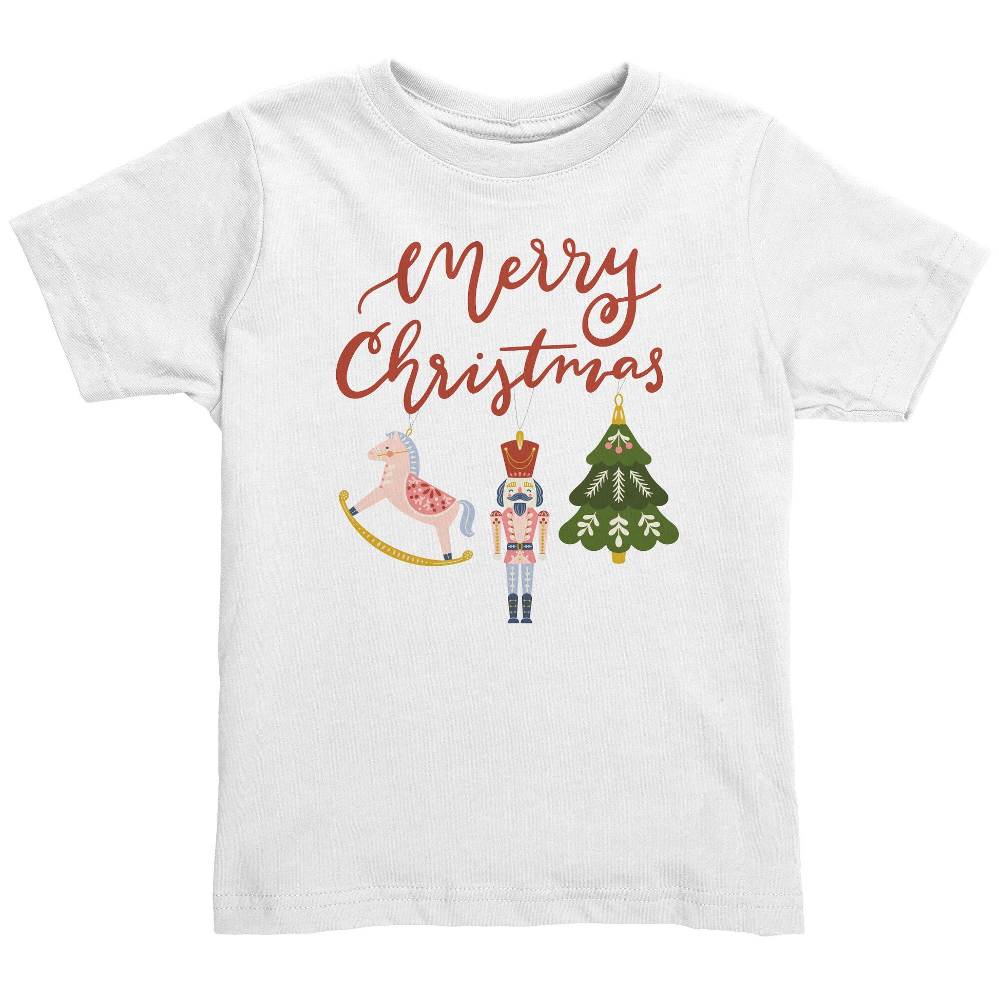 Merry Christmas Print Toddler Tshirt in 100% Cotton, adorable to wear in sibling holiday photos. Cute folk art holiday ornaments printed on White kids tshirts. Toddler clothes for girl or boy. Unique toddler gift features a rocking horse, nutcracker solider and Christmas tree printed ornaments on white shirt.