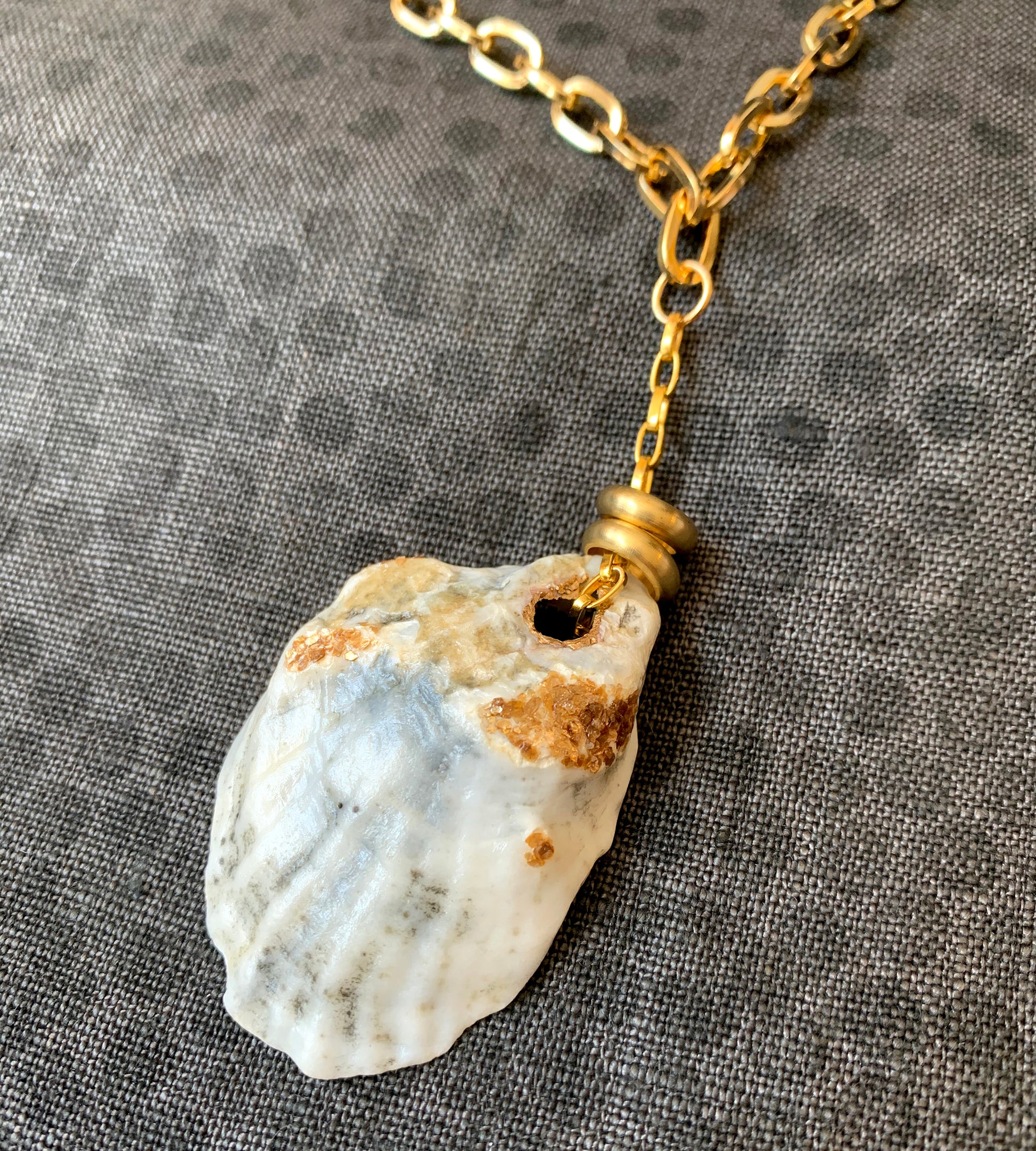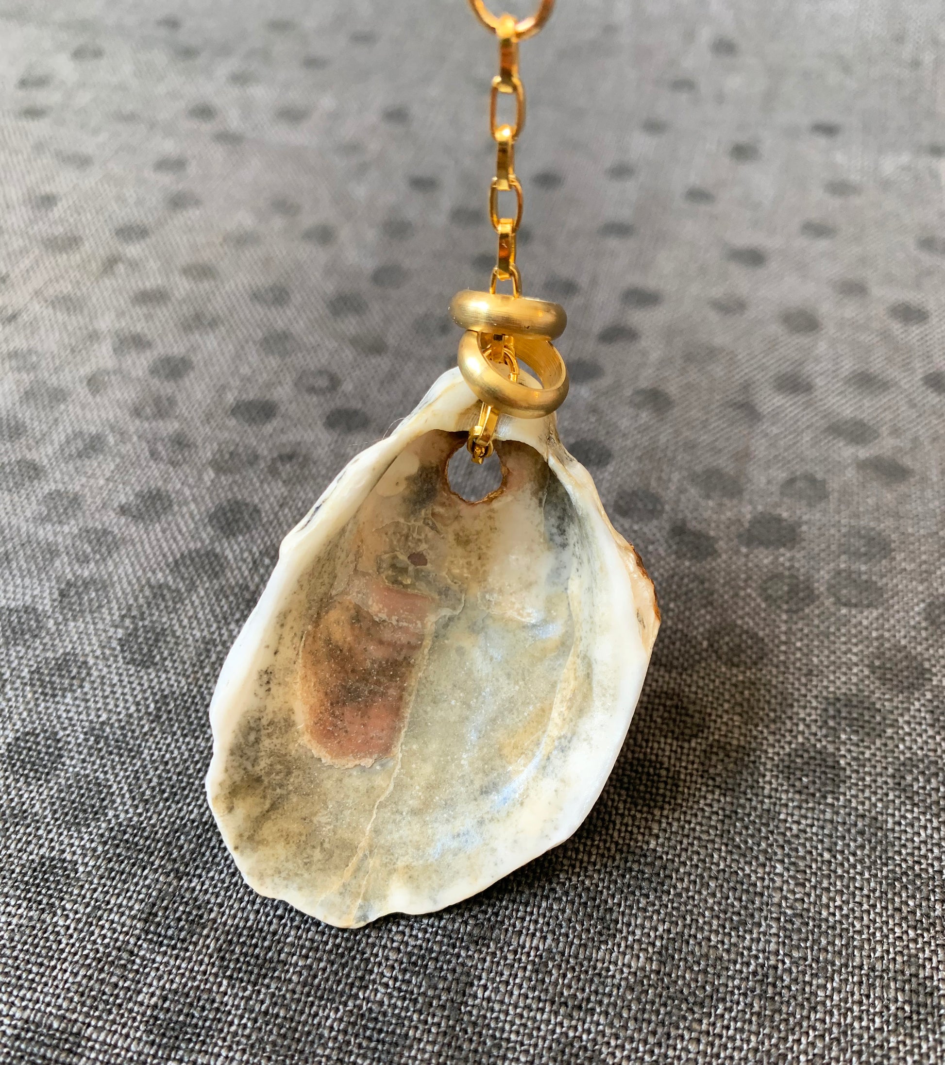 Handmade One-of-a-Kind Oyster Shell Necklace w/ Brass Rings. White oyster shell drop pendant features two brass rings that hang loosely on a delicate chain attached to a gold chunky paperclip style necklace. The genuine oyster shell is hand painted with sparkling gold mica shell flakes. This glamorous handmade piece of jewelry is one-of-a-kind! An exquisite nautical gift idea for sea lovers and shell collectors. This unique necklace can be a meaningful anniversary gift with the two brass rings representing rings..