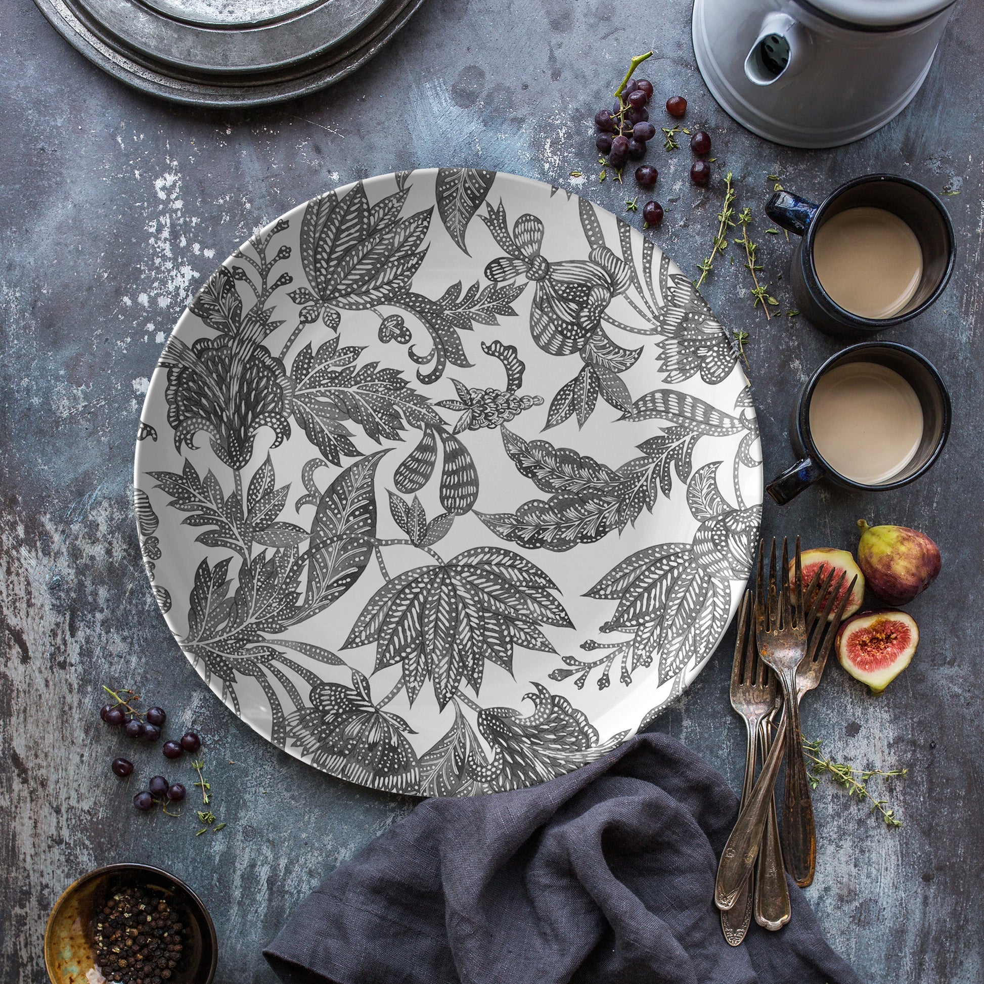Elevate your dining experience with our Floral Batik Print Plate. Made from Thermosaf resin, it's a safer alternative to melamine. Featuring an Indonesian batik print of original artwork showcasing a meticulously hand-painted watercolor design in black and white. These Luxury Thermosaf plastic plates are perfect for any occasion, from backyard barbeques to beach picnics. Versatile for both indoor and outdoor use. Food safe plastic dinnerware. Microwave and dishwasher safe for convenience.