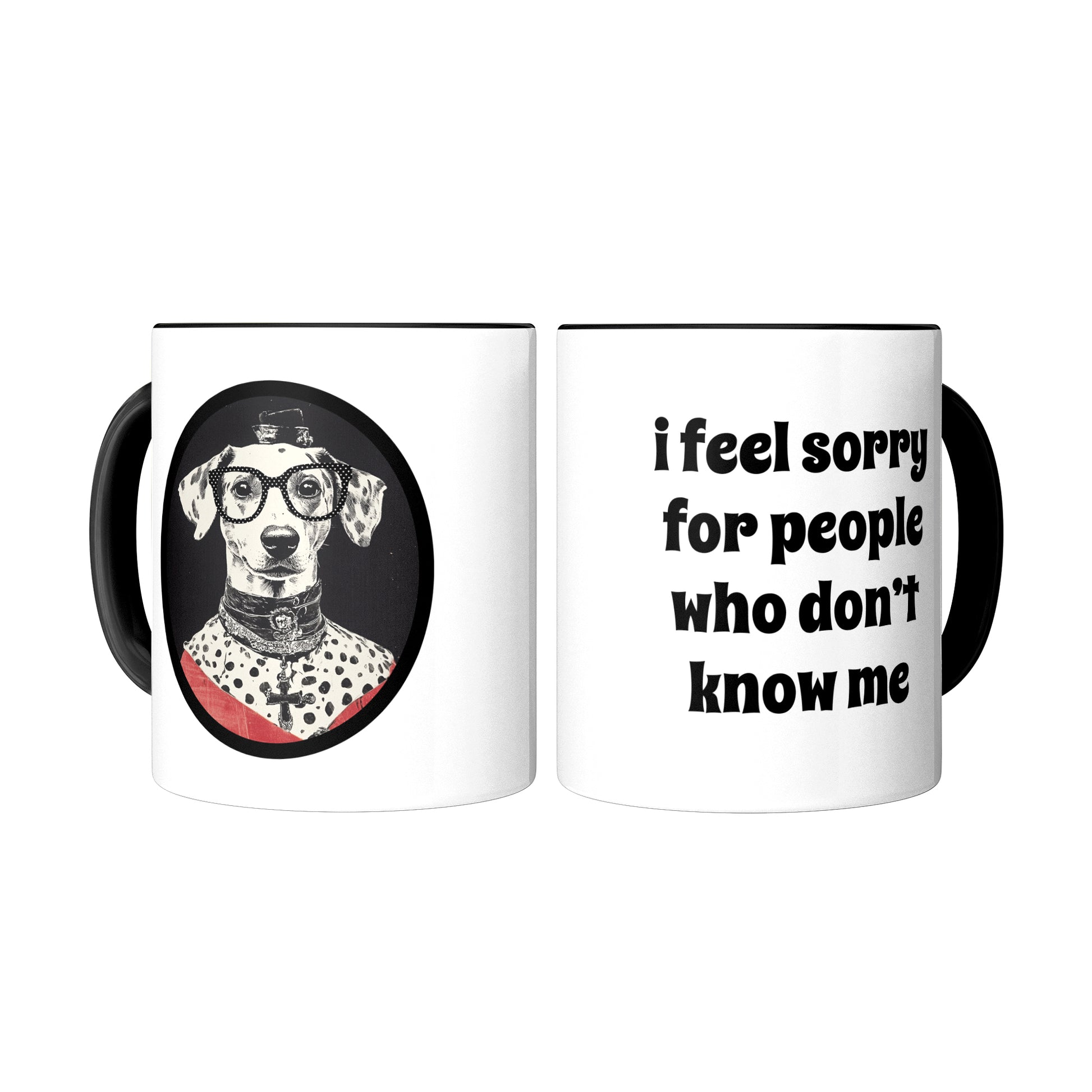 Serve up your personality with this hilarious mug featuring an impeccably dressed dog with a Victorian collar with jewelry and wonderfully chic polka dot glasses. Flip it around for the iconic line: “i feel sorry for people who don't know me”.