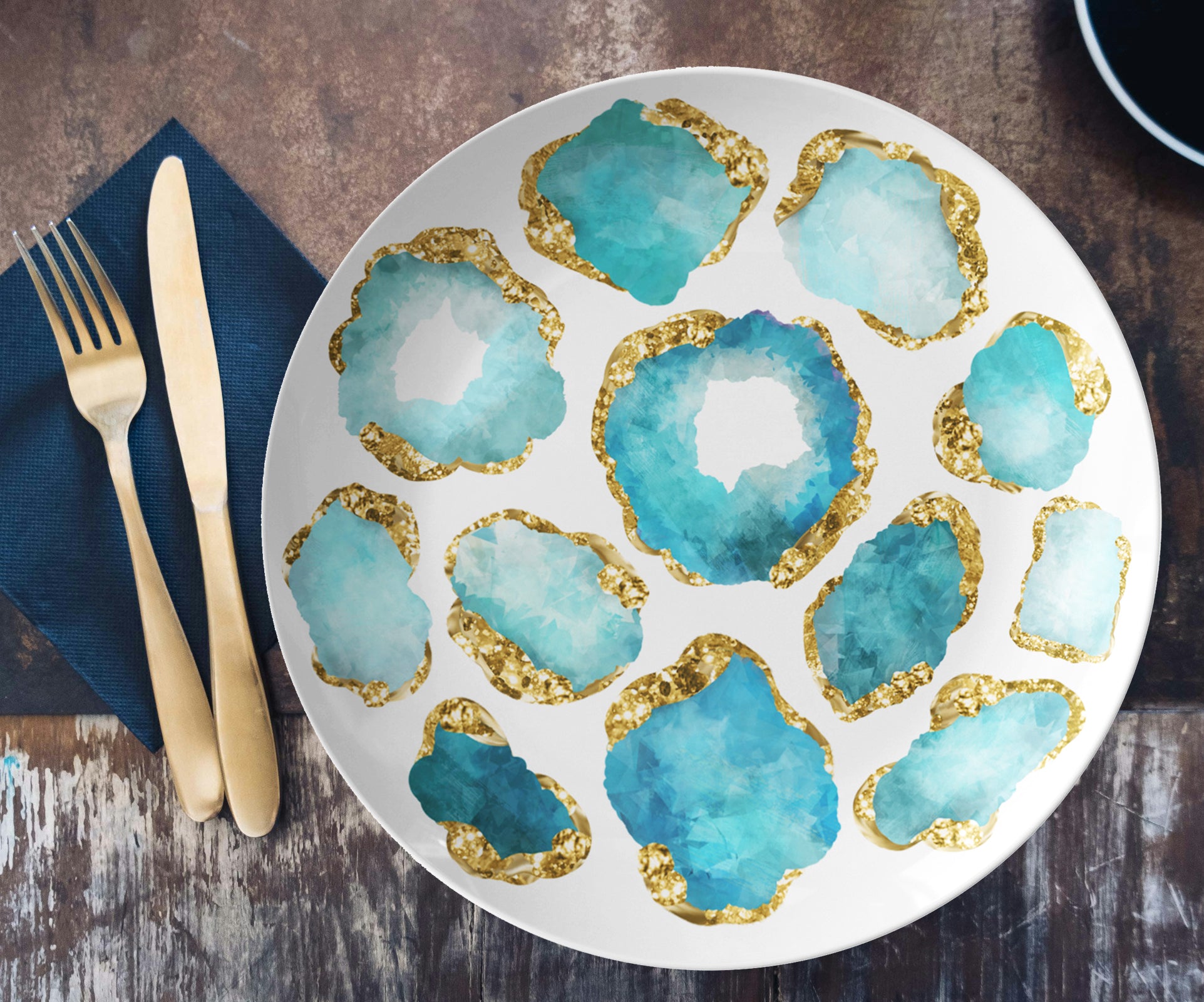 Luxury Aquamarine & Gold Gemstone Plastic Plates – Choose Single or Set