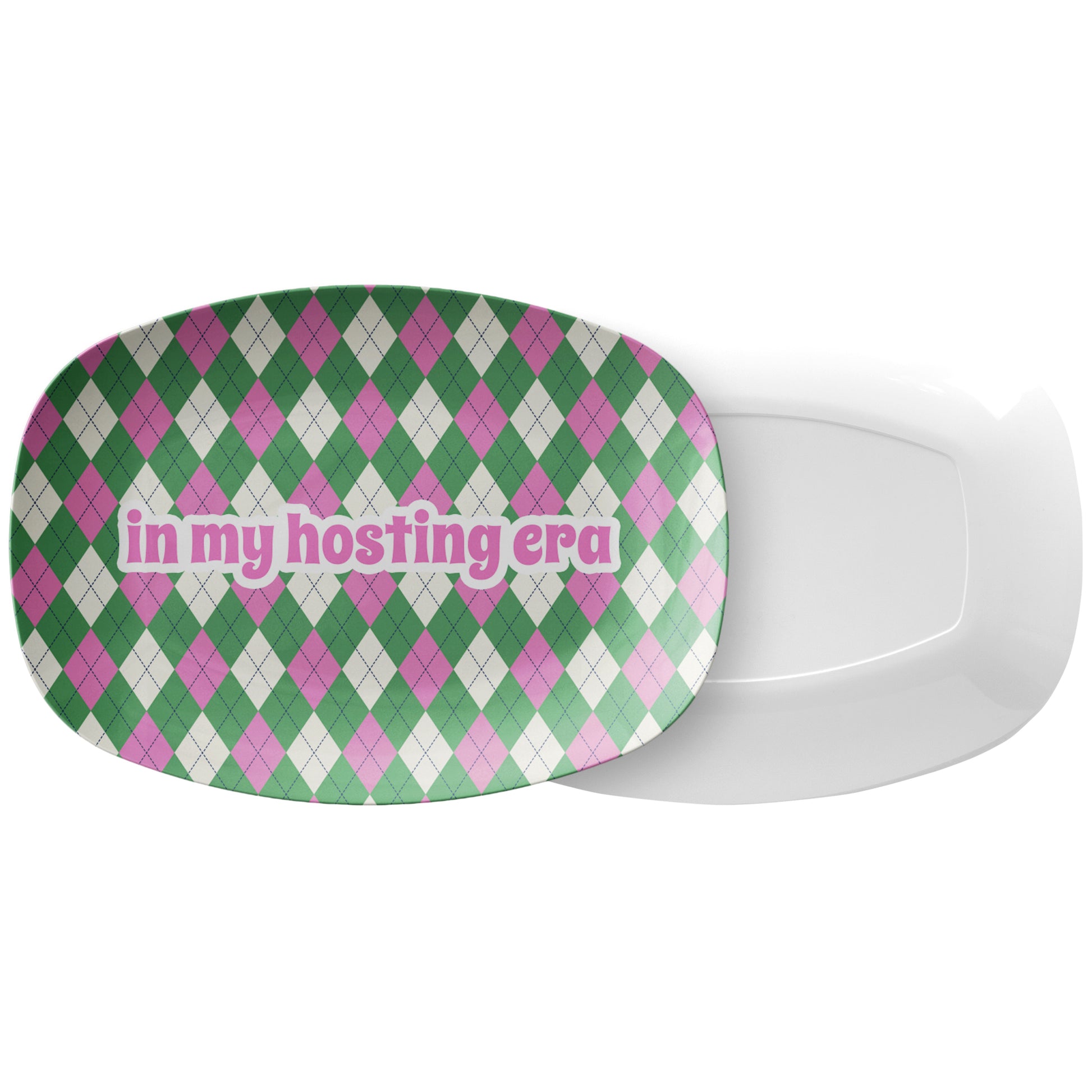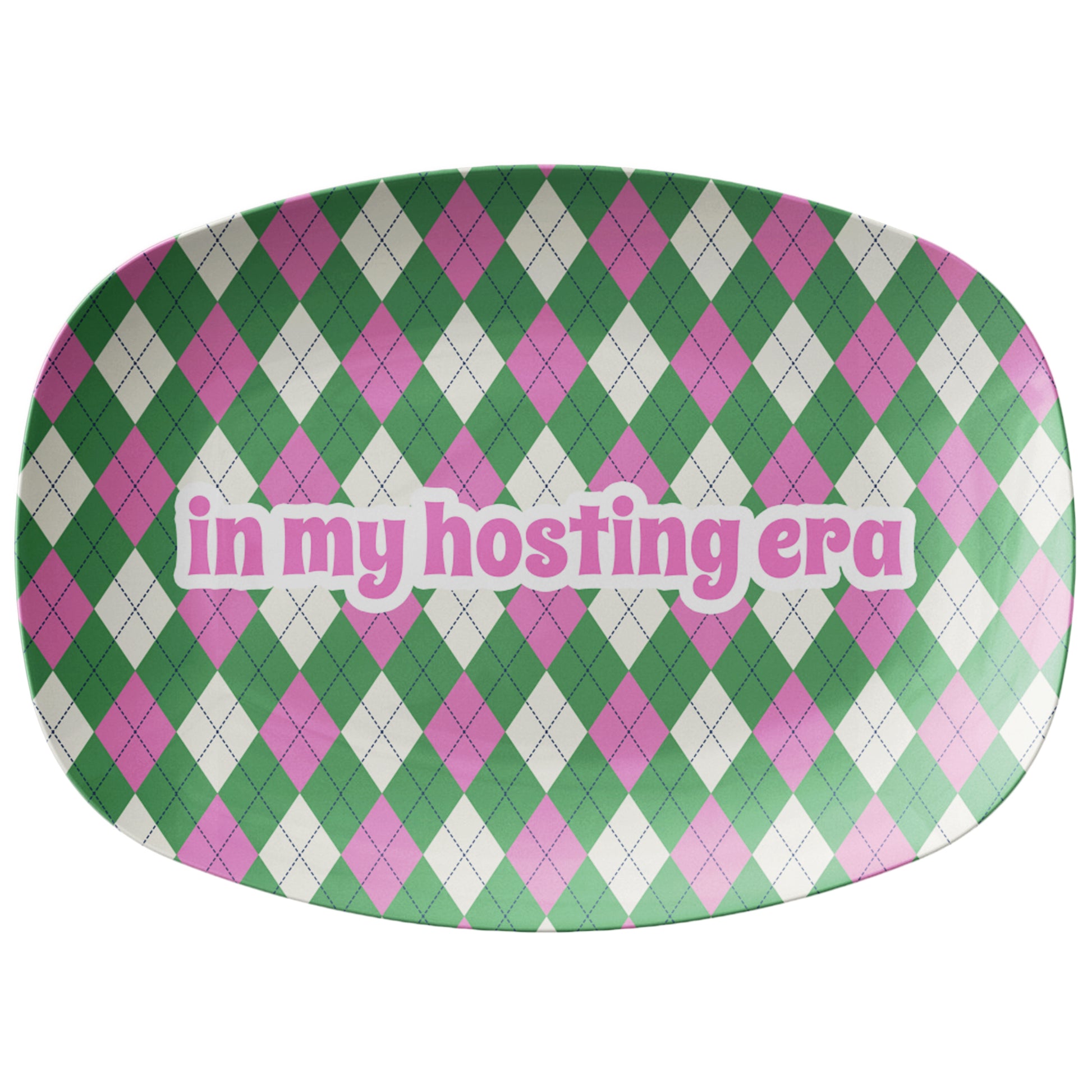 Preppy chic green and pink argyle pattern serving platter with a sassy phrase "in my hosting era" printed in all lowercase letters.