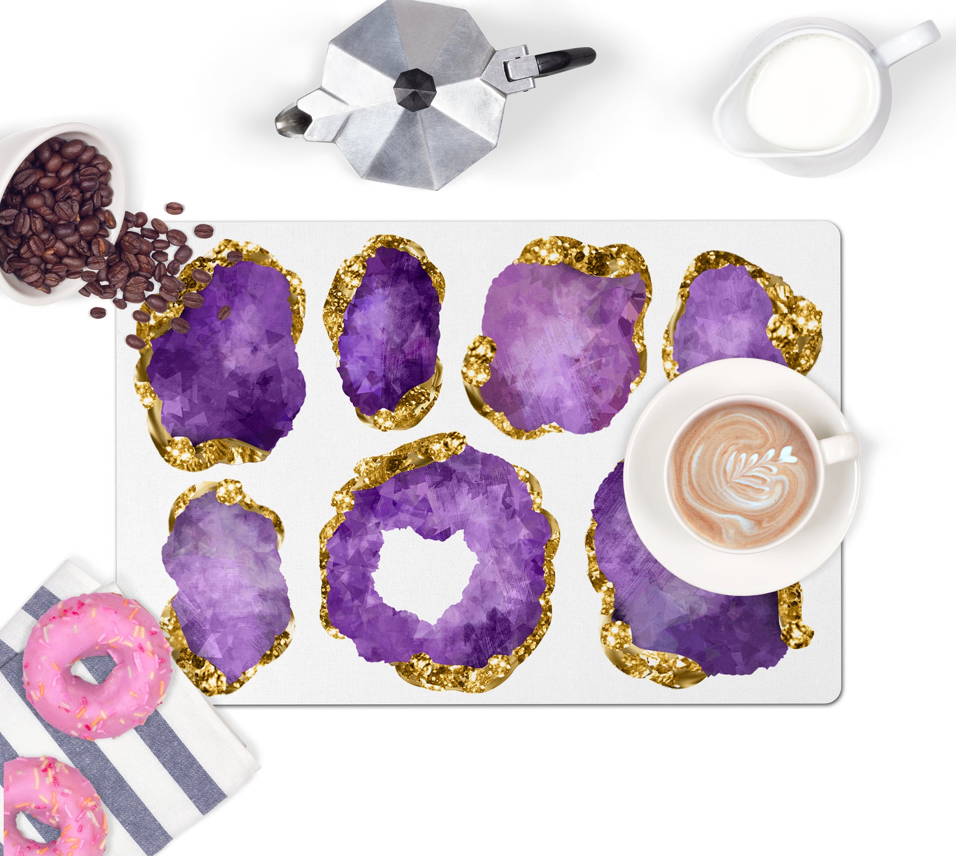 Amethyst and gold large gemstones fabric mat is a must-have to glam up and protect your kitchen counter, desk, coffee station, and bar cart! Also may be used as an oversized mouse pad or underneath indoor plants. 18"L x 12"H x 1/8"thick. Printed one at a time at our studio in New Jersey.