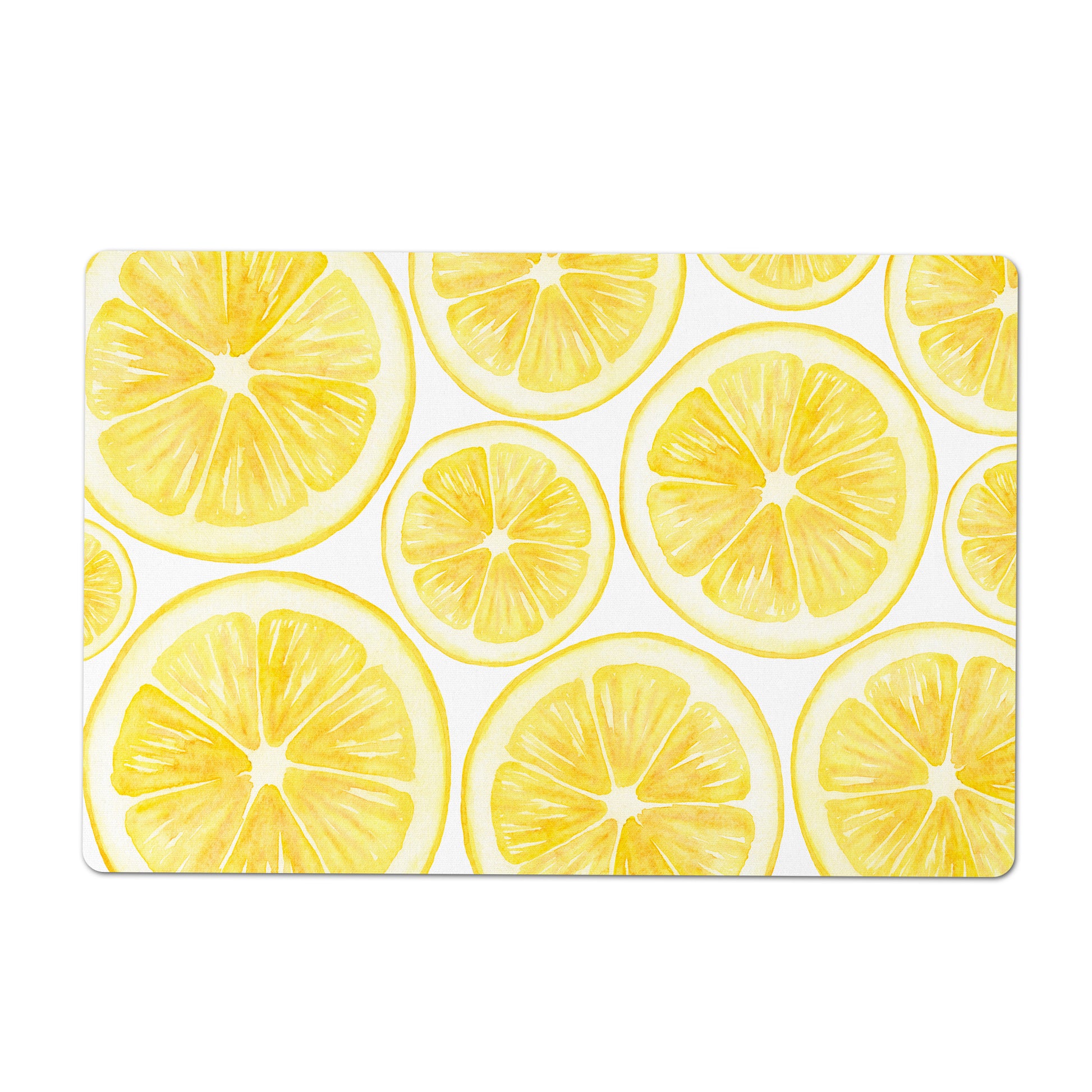 Yellow and white sliced lemon pattern is printed on soft fabric polyester that reverses to non-skid black rubber backing on the back.