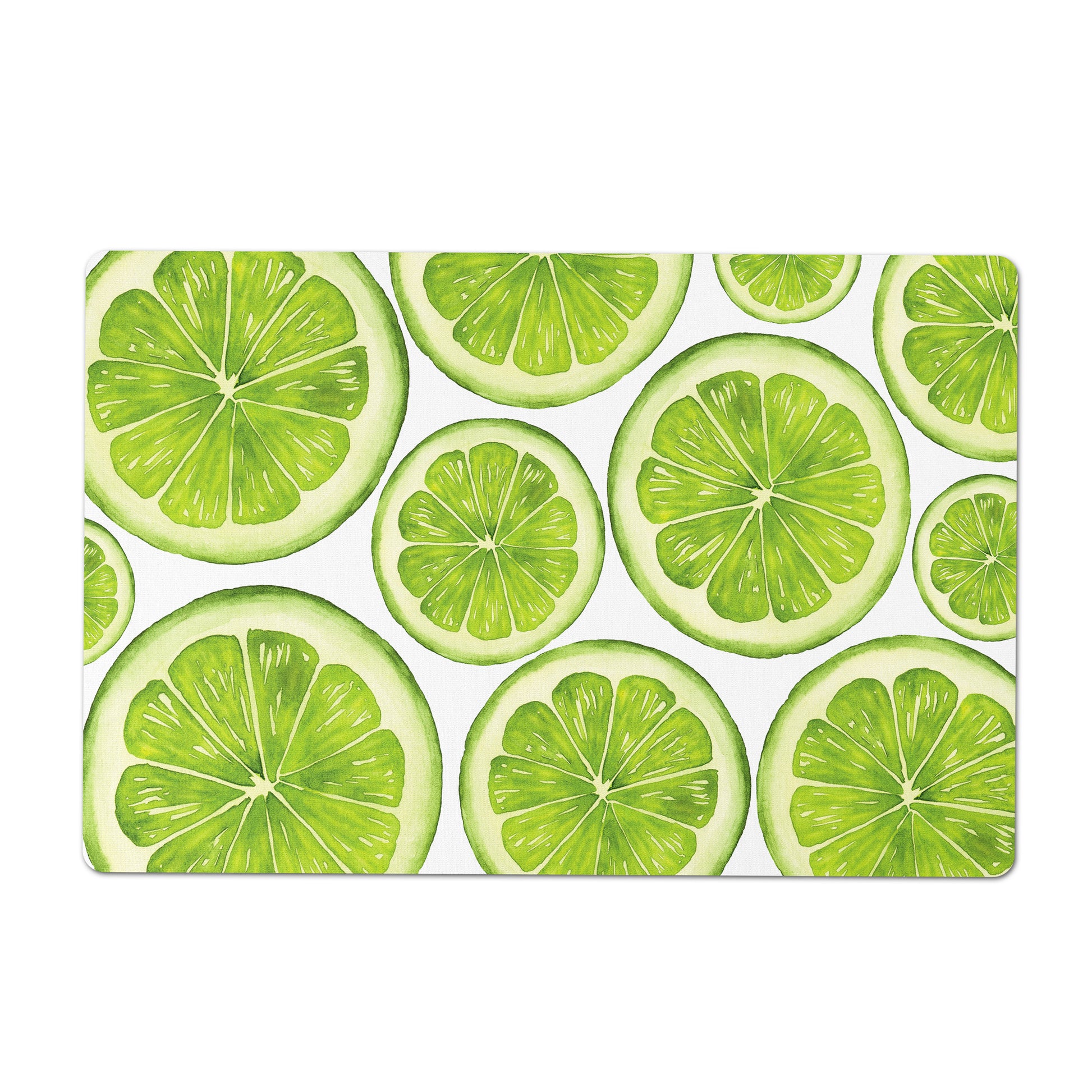 Green and white sliced limes pattern is printed on soft fabric polyester that reverses to non-skid black rubber backing on the back.