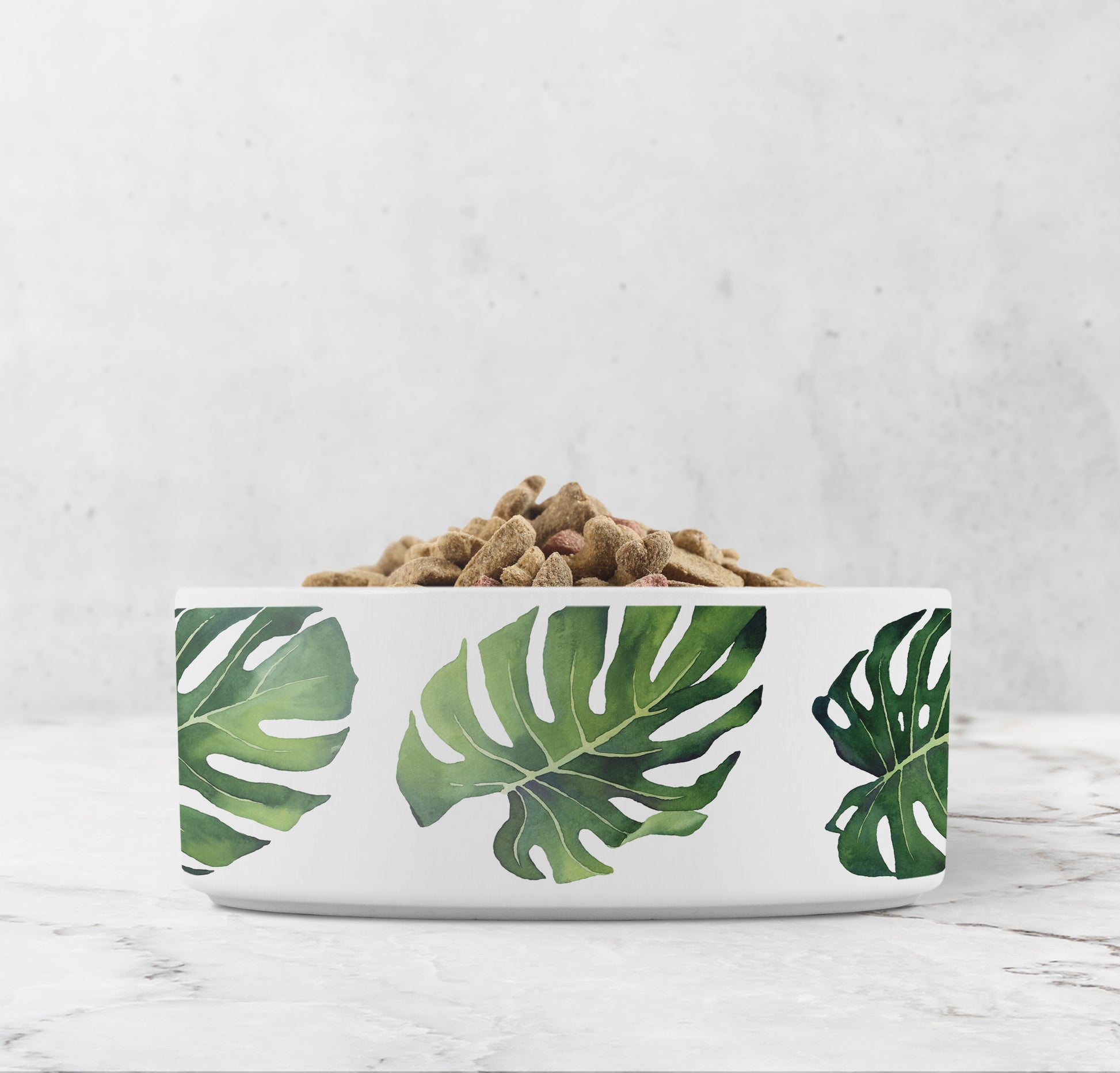 Monstera Leaf Pet Bowl, Ceramic, Green and White