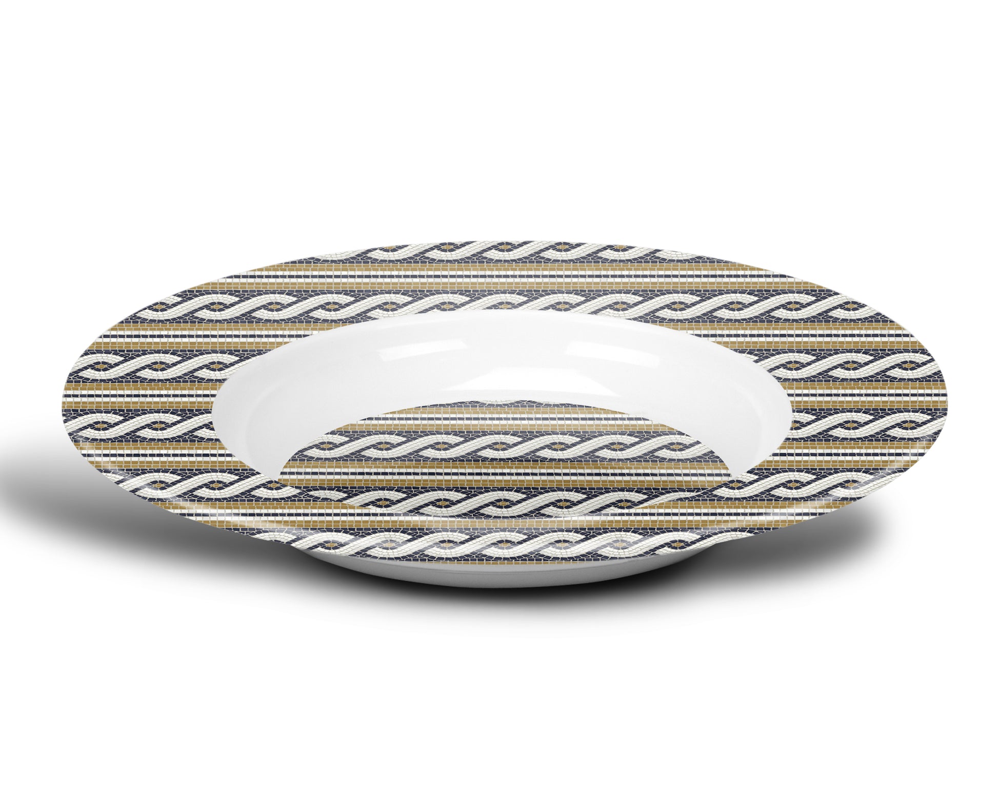 Sold individually or as a Set of FOUR, Rim Soup Bowls featuring cream, gold and black mosaic tiles in a rope braid stripe pattern. These plastic bowls are perfect for enjoying salads, pasta, and soup. Add a touch of sophistication and elegance to your table with these exclusive bowls. Luxury Decoware® plastic bowls are perfect for any occasion, from backyard barbeques to beach picnics. Versatile for both indoor and outdoor use. Food safe plastic dinnerware. Microwave and dishwasher safe for convenience.