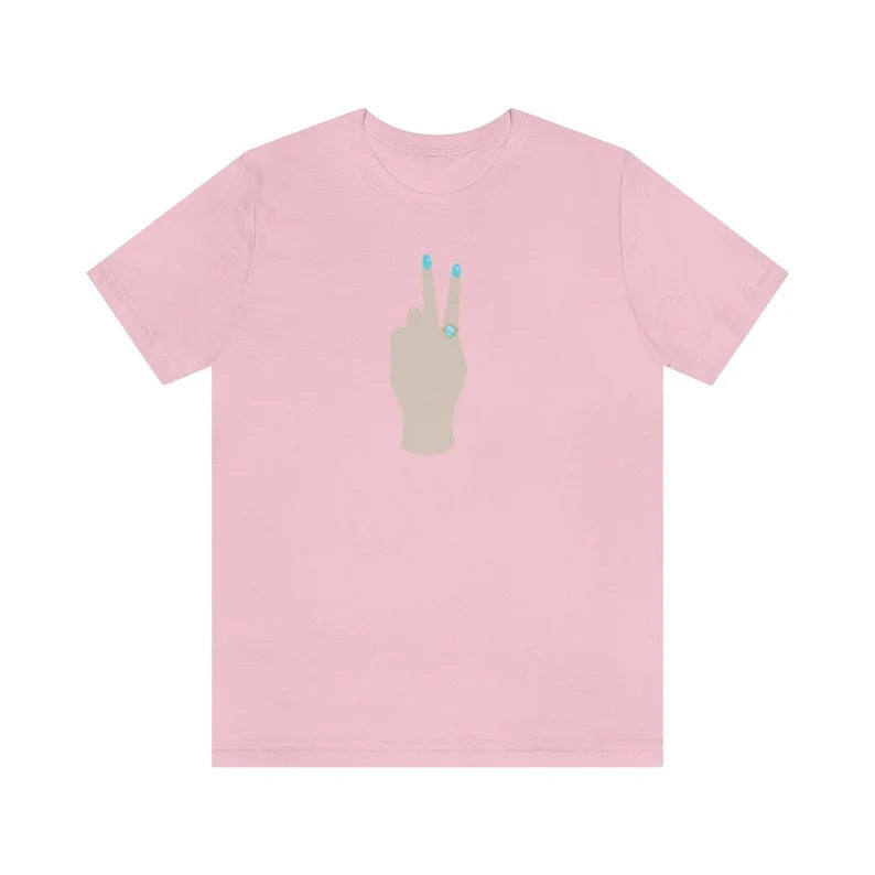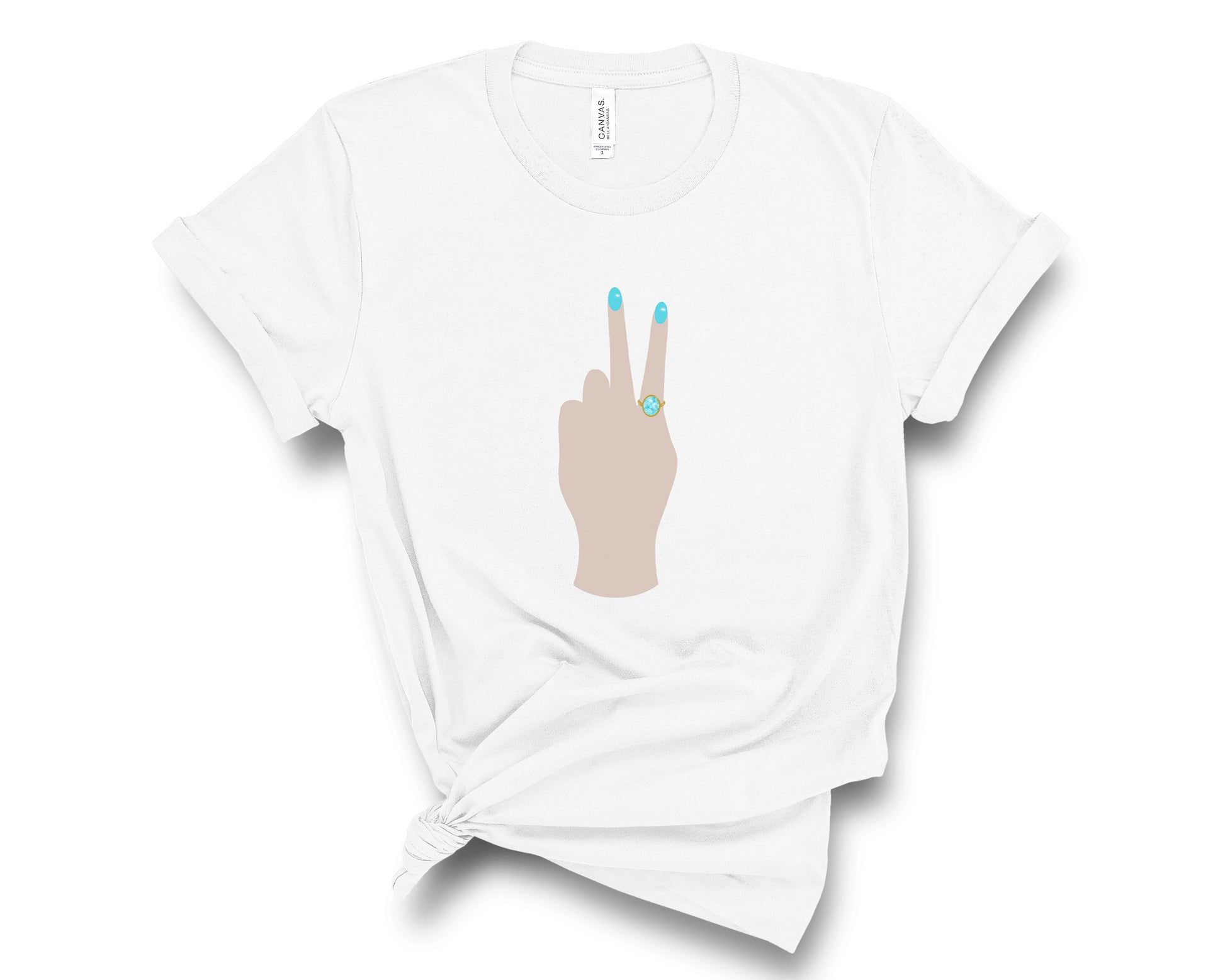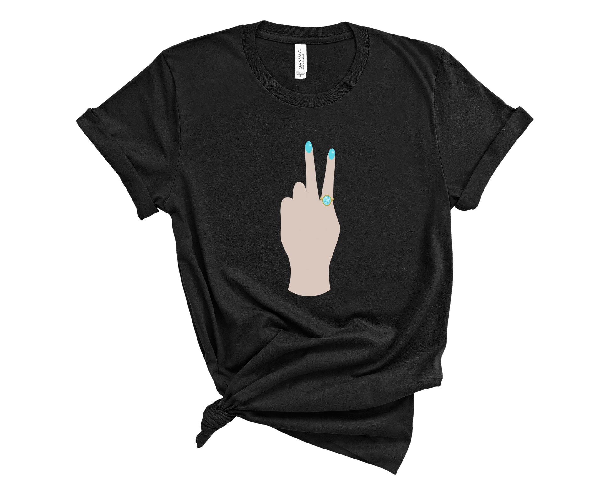 Women's t-shirt featuring a Peace Sign print. The classic crewneck short sleeve tee showcases a hand adorned with a glamorous aqua ring and a stunning light blue manicure flashing the iconic peace sign. A truly exceptional gift for any elegant woman.