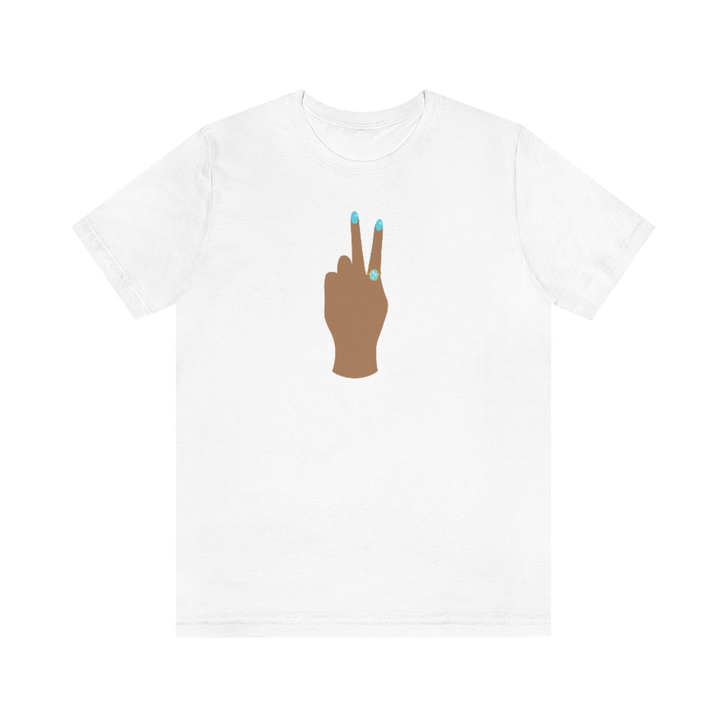 Peace Sign print t-shirt for women. Classic crewneck short sleeve tee features a hand wearing a glamorous aqua ring and a fabulous light blue manicure showing the peace sign. Fantastic gift for her.