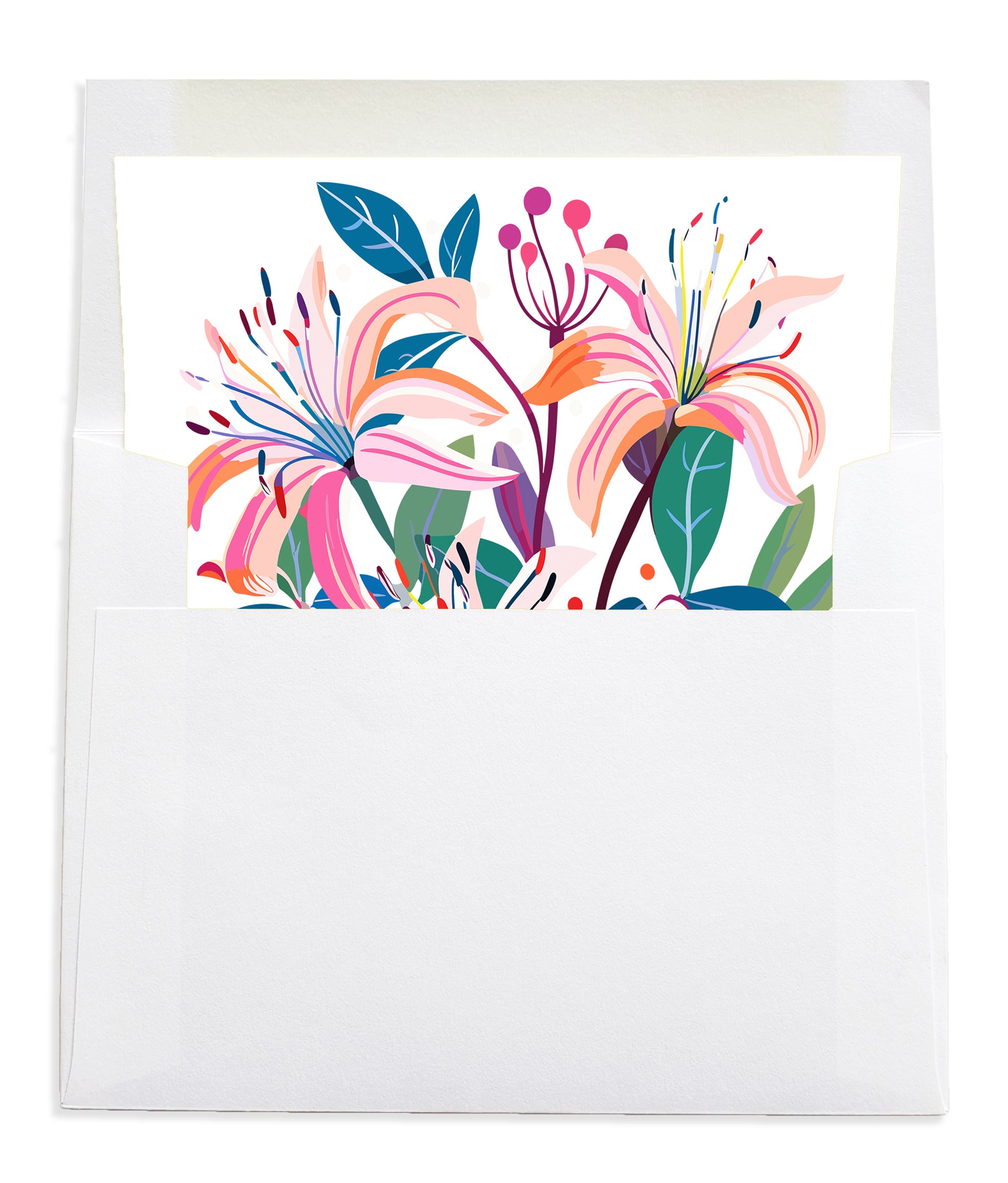 Each white envelope is hand-lined with the same vibrant floral artwork, creating a beautiful surprise when opened—an unexpected detail that elevates every note and leaves a lasting impression.