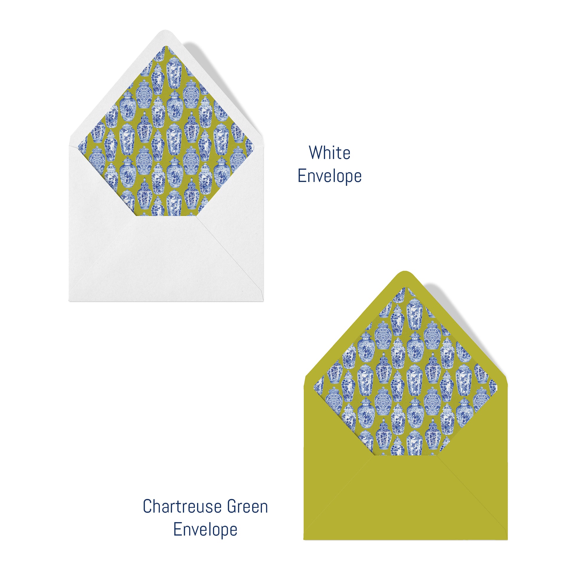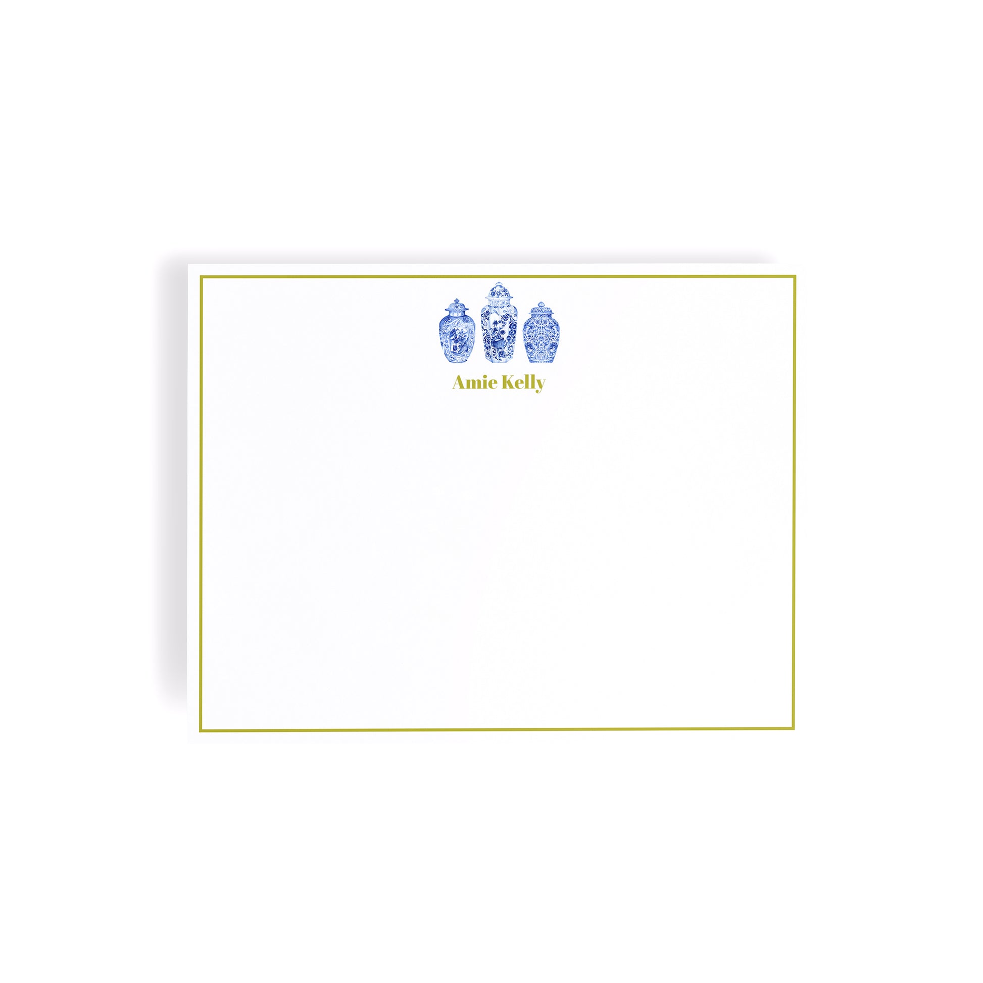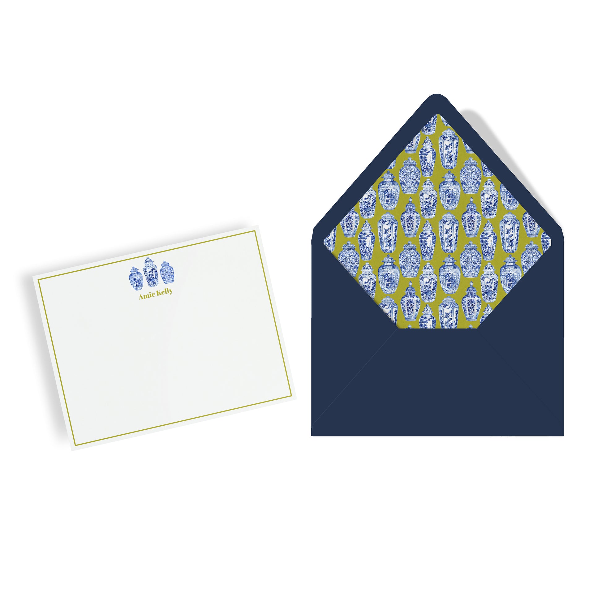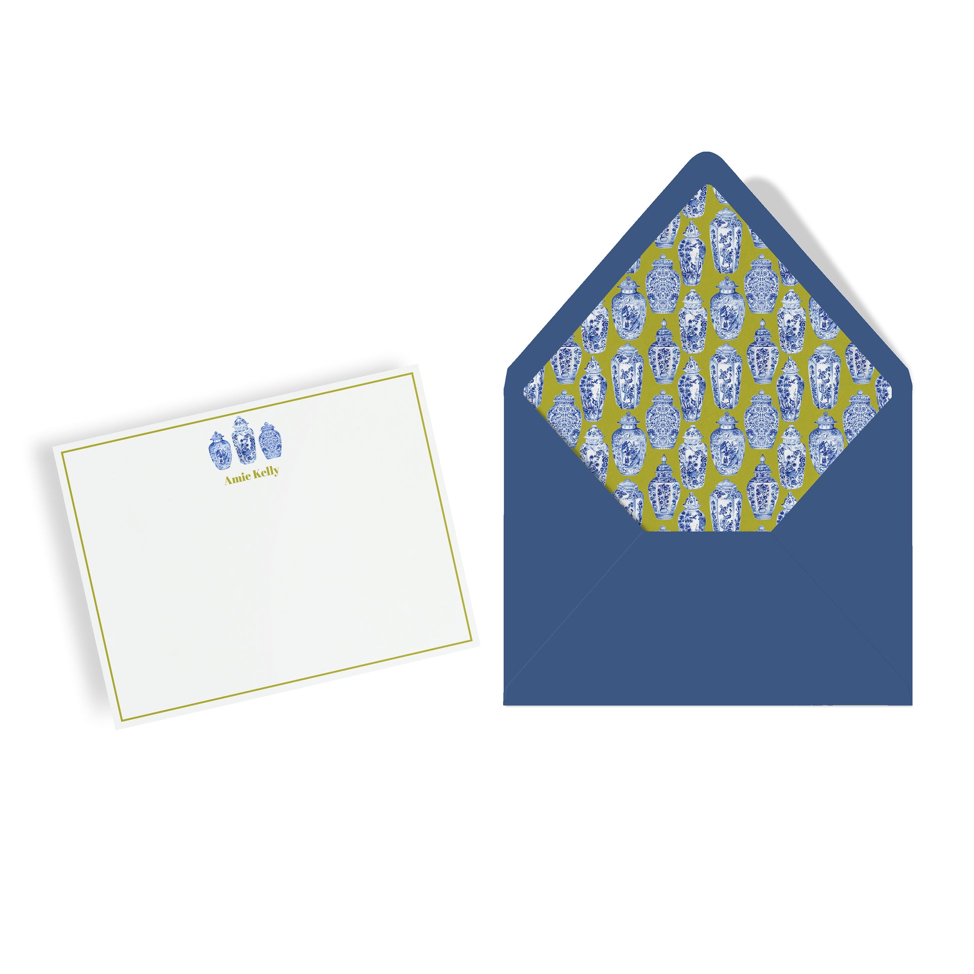 Elevate your correspondence with our exquisite Personalized Stationery Notecards and Hand-lined Envelopes, featuring the timeless elegance of Chinoiserie Blue & White Ginger Jars design with modern Chartreuse Green accents: custom text and border.