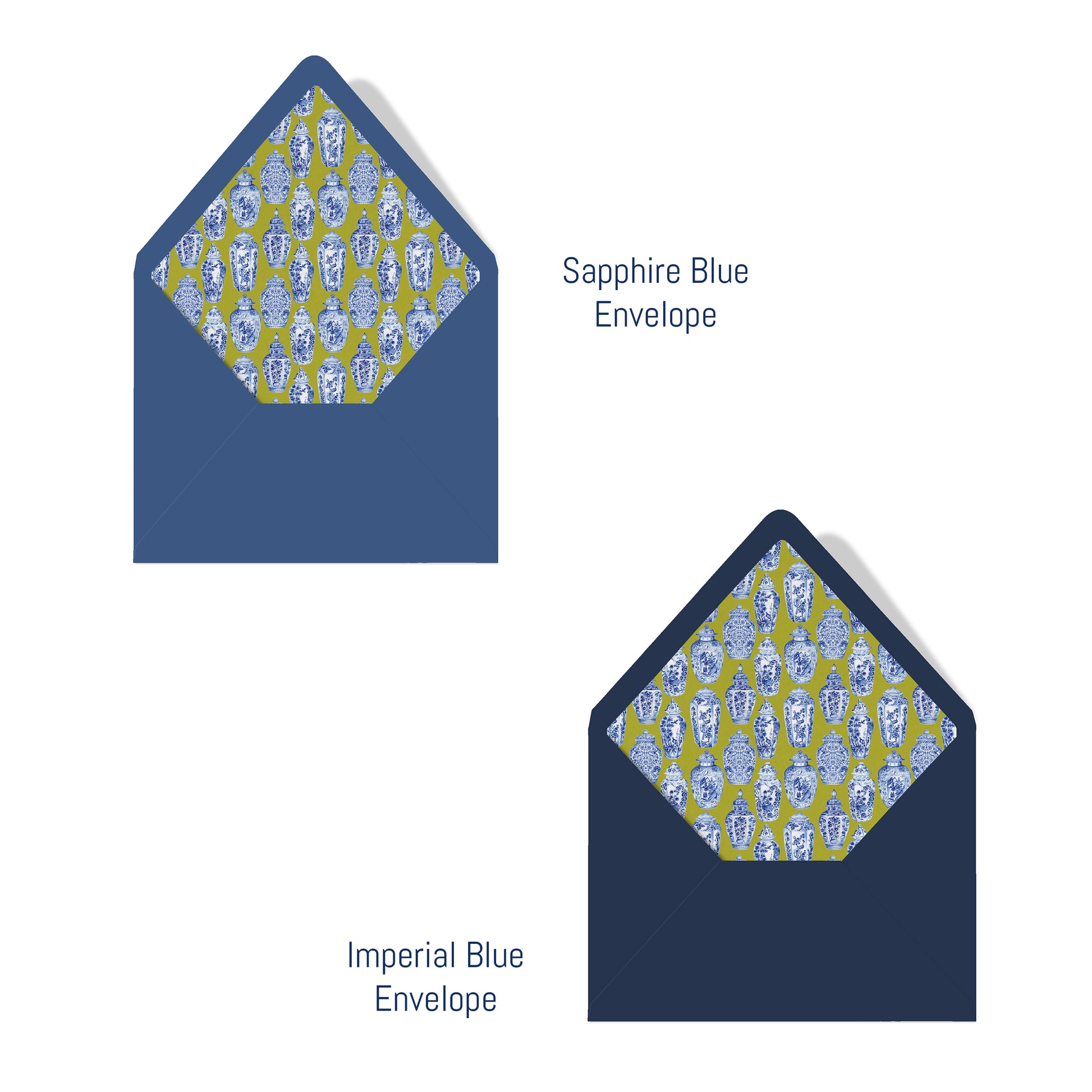 Each set is custom printed with your name or monogram alongside three captivating ginger jar designs, ensuring a personal touch that reflects your style. Our euro-style envelopes are hand-lined with patterned papers showcasing an all-over print of ginger jars, providing a luxurious enclosure for your messages.