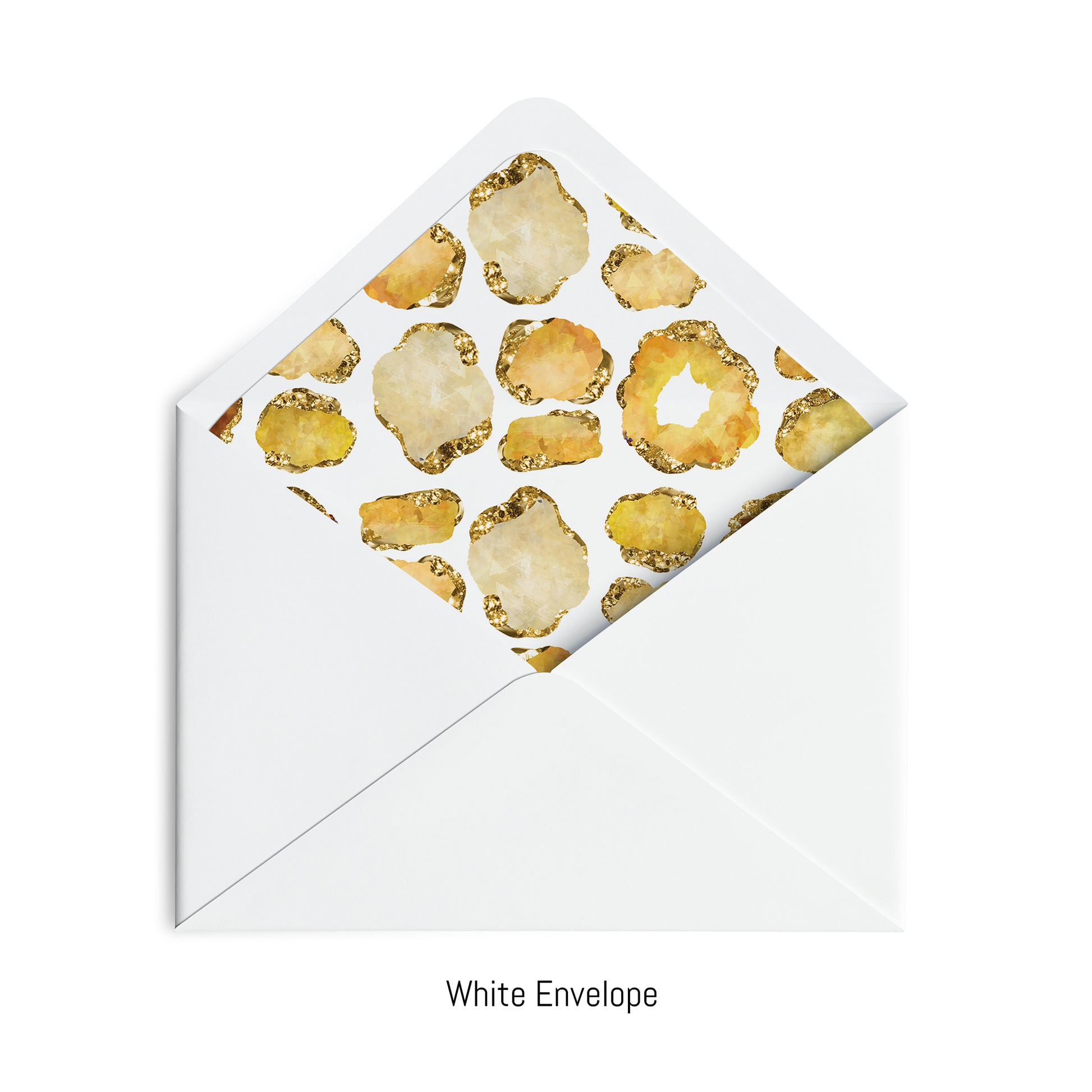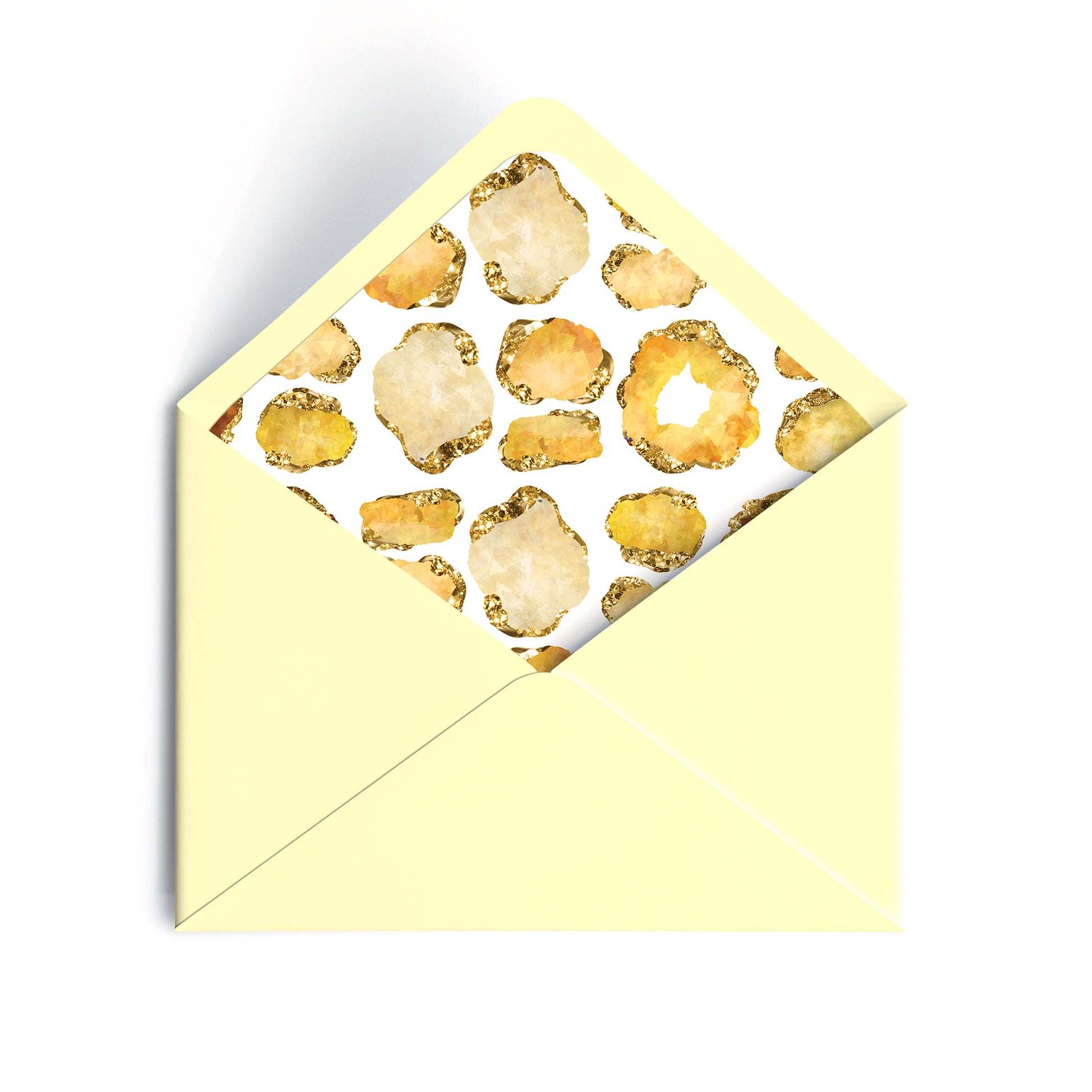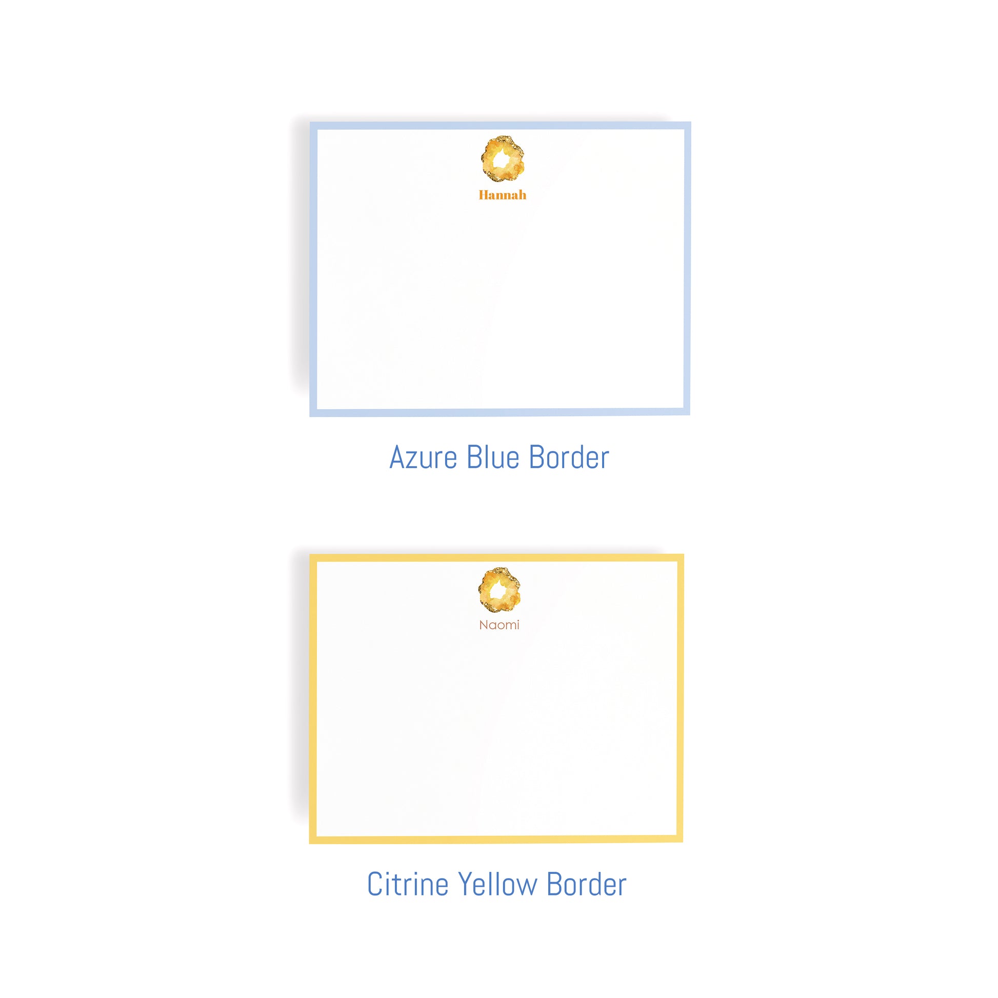 Custom printed with your name or monogram and a single Citrine geode druzy gemstone with gold-tone border. To complete the look, each notecard has a coordinating solid color border that complements the gemstone’s rich hues. Matching euro flap envelopes echo this elegant detail with hand-lined gemstone collage prints and a solid color exterior to match. The gemstones and gold details are flat printed illustrations, not real metallic or foil accents.
