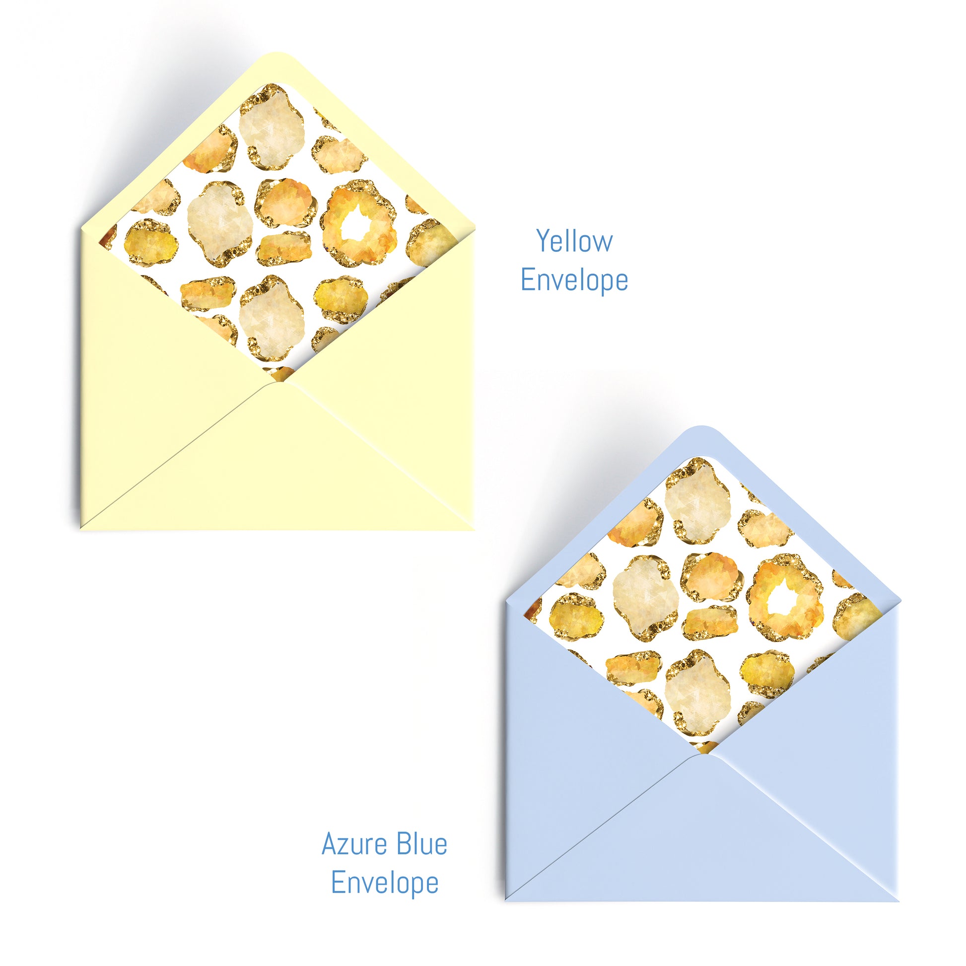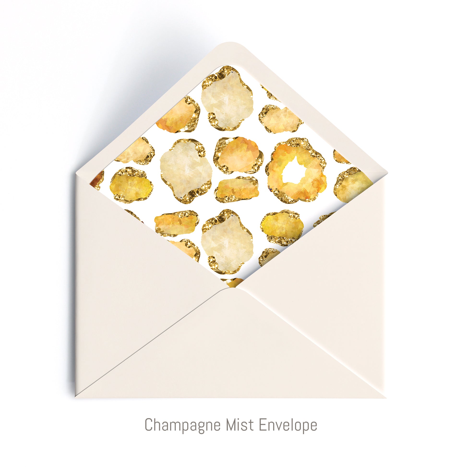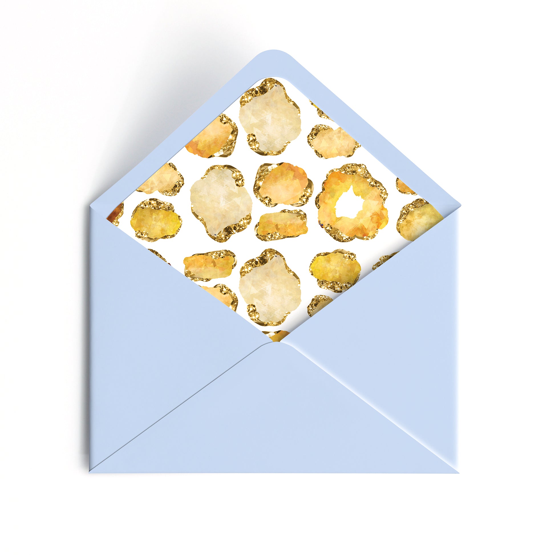 Custom printed with your name or monogram and a single Citrine geode druzy gemstone with gold-tone border. To complete the look, each notecard has a coordinating solid color border that complements the gemstone’s rich hues. Matching euro flap envelopes echo this elegant detail with hand-lined gemstone collage prints and a solid color exterior to match. The gemstones and gold details are flat printed illustrations, not real metallic or foil accents.