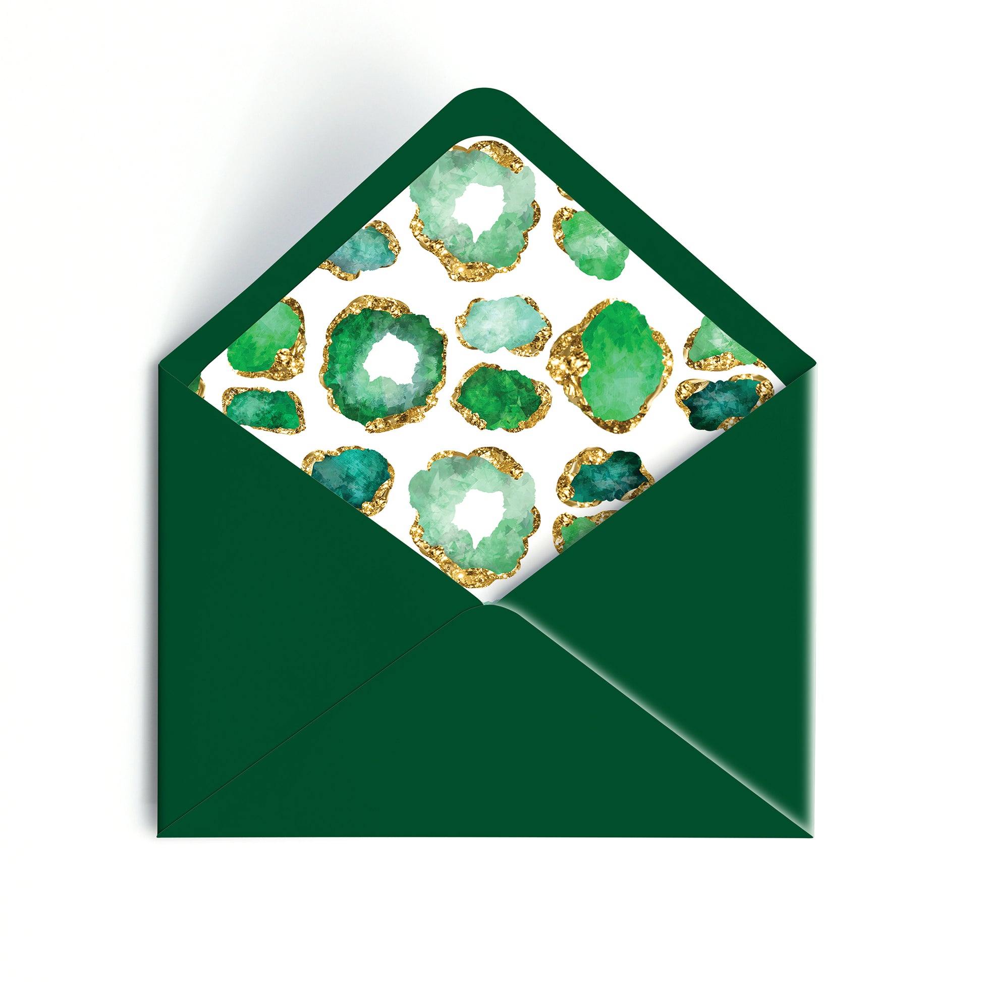 Custom printed with your name or monogram and a single Emerald geode druzy gemstone with gold-tone border. To complete the look, each notecard has a coordinating solid color border that complements the gemstone’s rich hues. Matching euro flap envelopes echo this elegant detail with hand-lined gemstone collage prints and a solid color exterior to match. The gemstones and gold details are flat printed illustrations, not real metallic or foil accents.