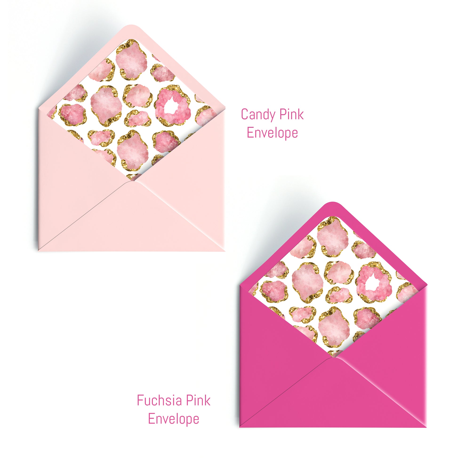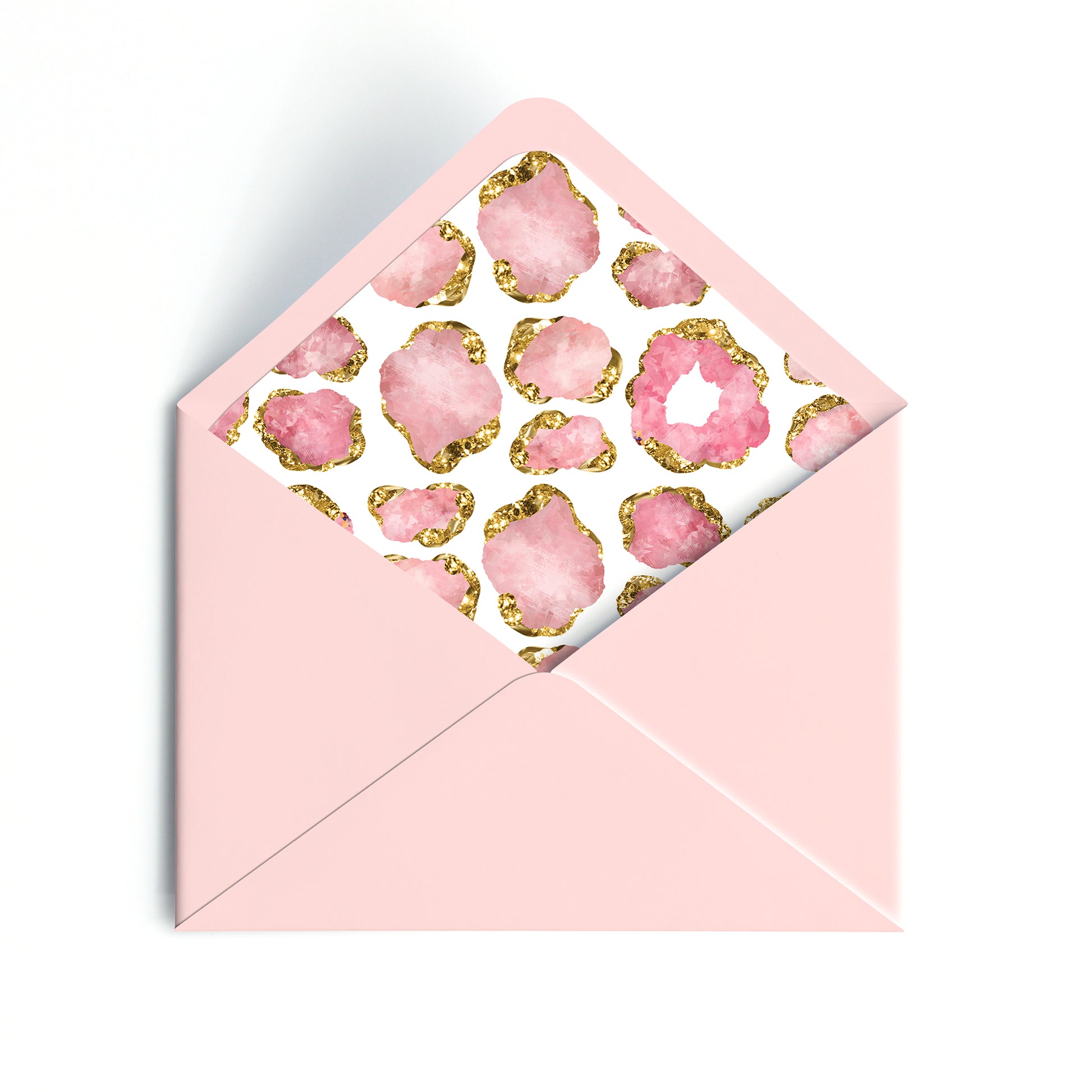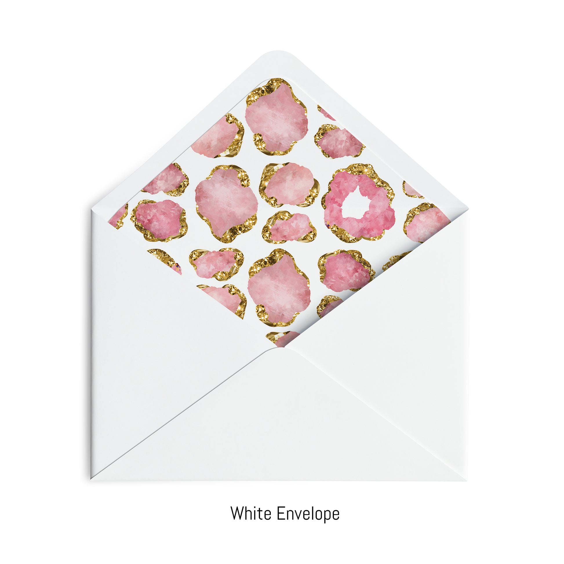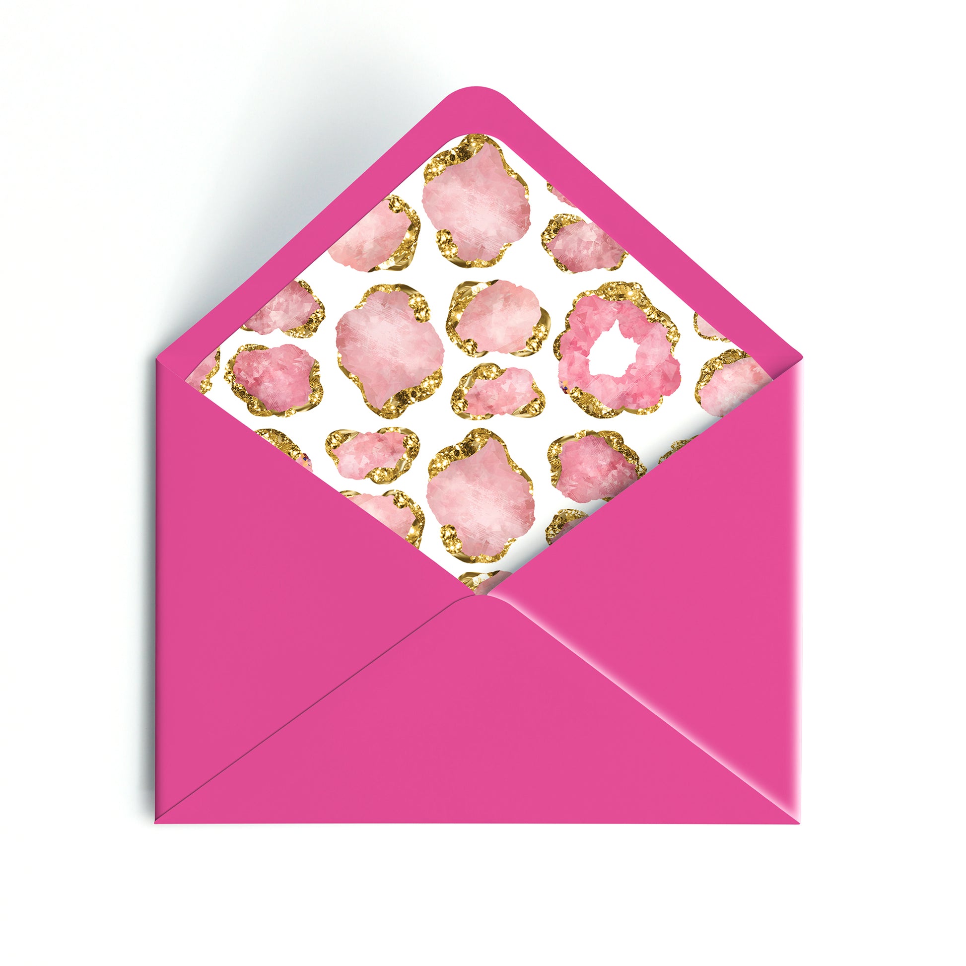 Custom printed with your name or monogram and a single Pink Rose Quartz geode druzy gemstone with gold-tone border. To complete the look, each notecard has a coordinating solid color border that complements the gemstone’s rich hues. Matching euro flap envelopes echo this elegant detail with hand-lined gemstone collage prints and a solid color exterior to match. The gemstones and gold details are flat printed illustrations, not real metallic or foil accents.