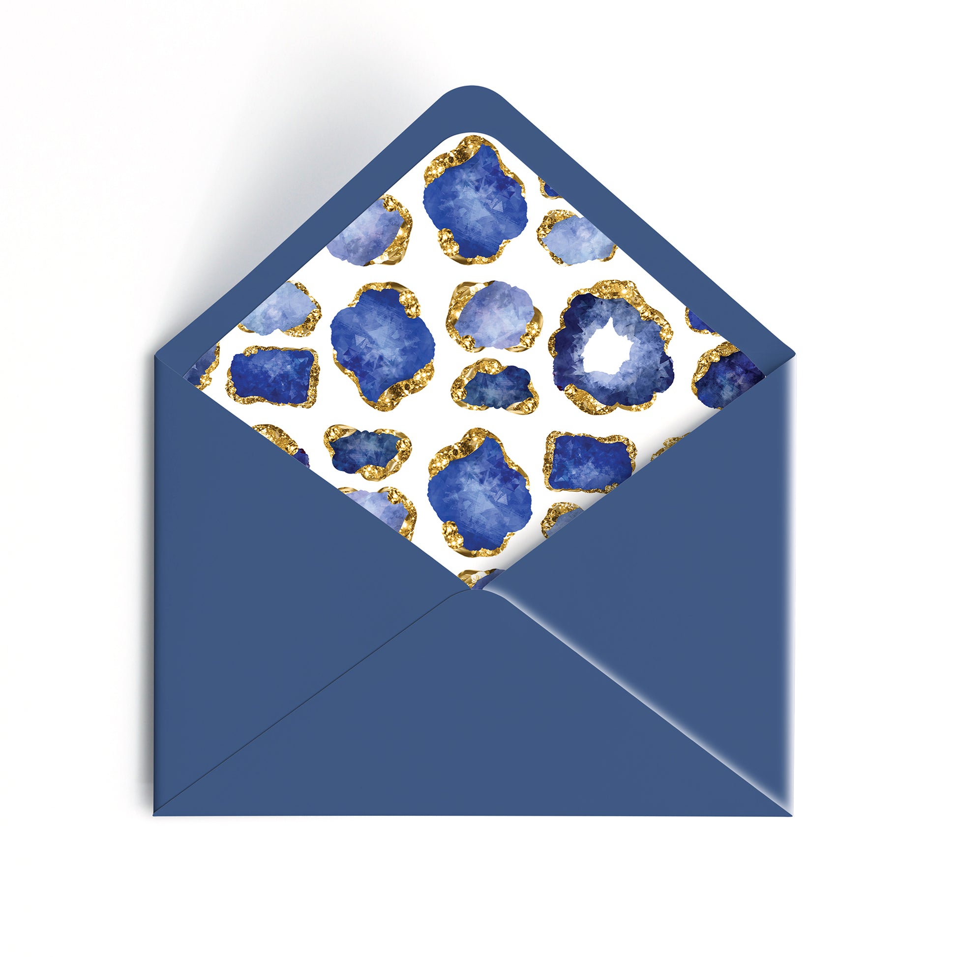 Custom printed with your name or monogram and a single Blue Sapphire geode druzy gemstone with gold-tone border. To complete the look, each notecard has a coordinating solid color border that complements the gemstone’s rich hues. Matching euro flap envelopes echo this elegant detail with hand-lined gemstone collage prints and a solid color exterior to match. The gemstones and gold details are flat printed illustrations, not real metallic or foil accents.