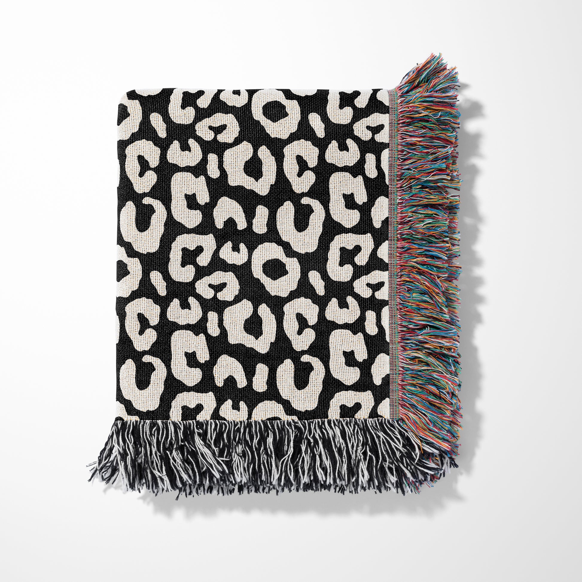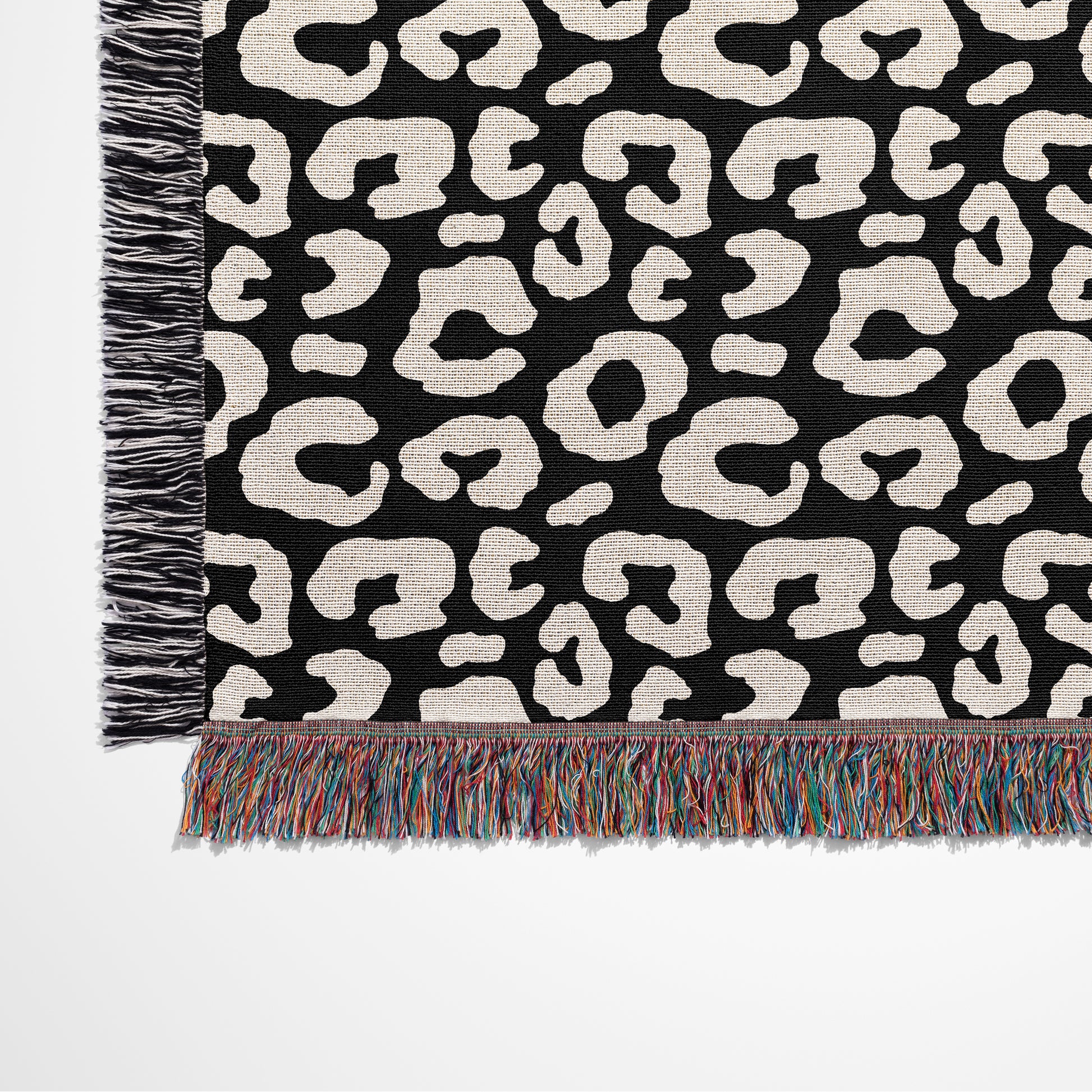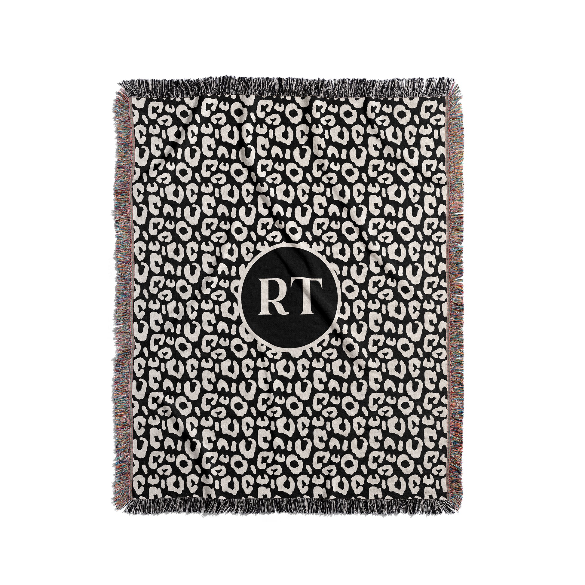 Personalized Blanket or Throw. Wrap yourself, or someone special, in the artistry of woven design with this stylish black and cream throw blanket. This classic leopard pattern is crafted through an intricate weaving process using 100% pure cotton yarn for a soft, luxurious feel. Each piece is a true work of art that brings warmth, texture and style to any room. Black/Cream and multi-color alternating 2” fringed edges elevate the look. Personalize with initials, name(s), custom text or warm wishes in round black frame at center. The perfect one-of-a-kind personalized gift.