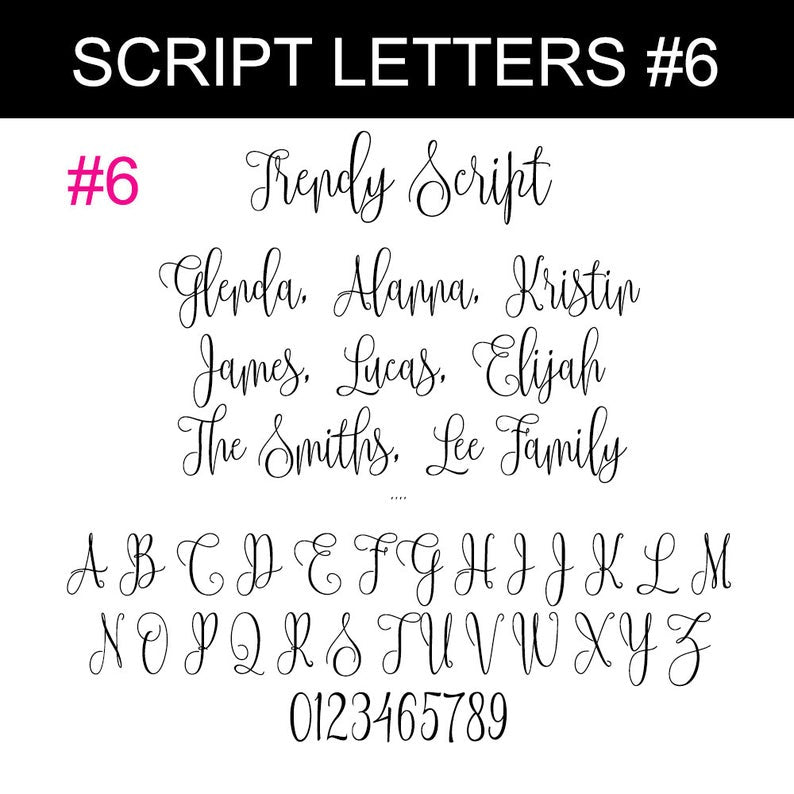 Please view the numbered FONT style choices in the photos to choose your font style.