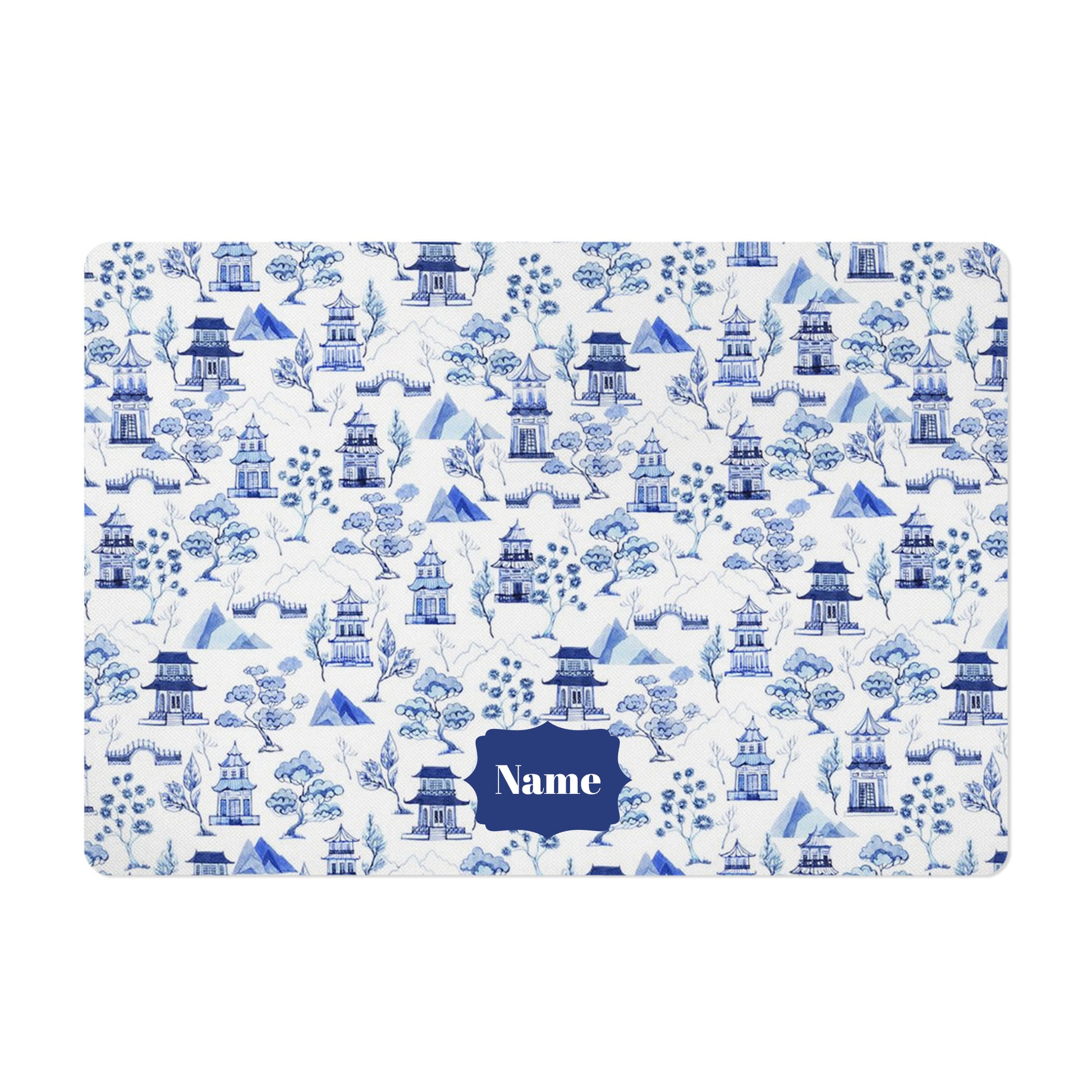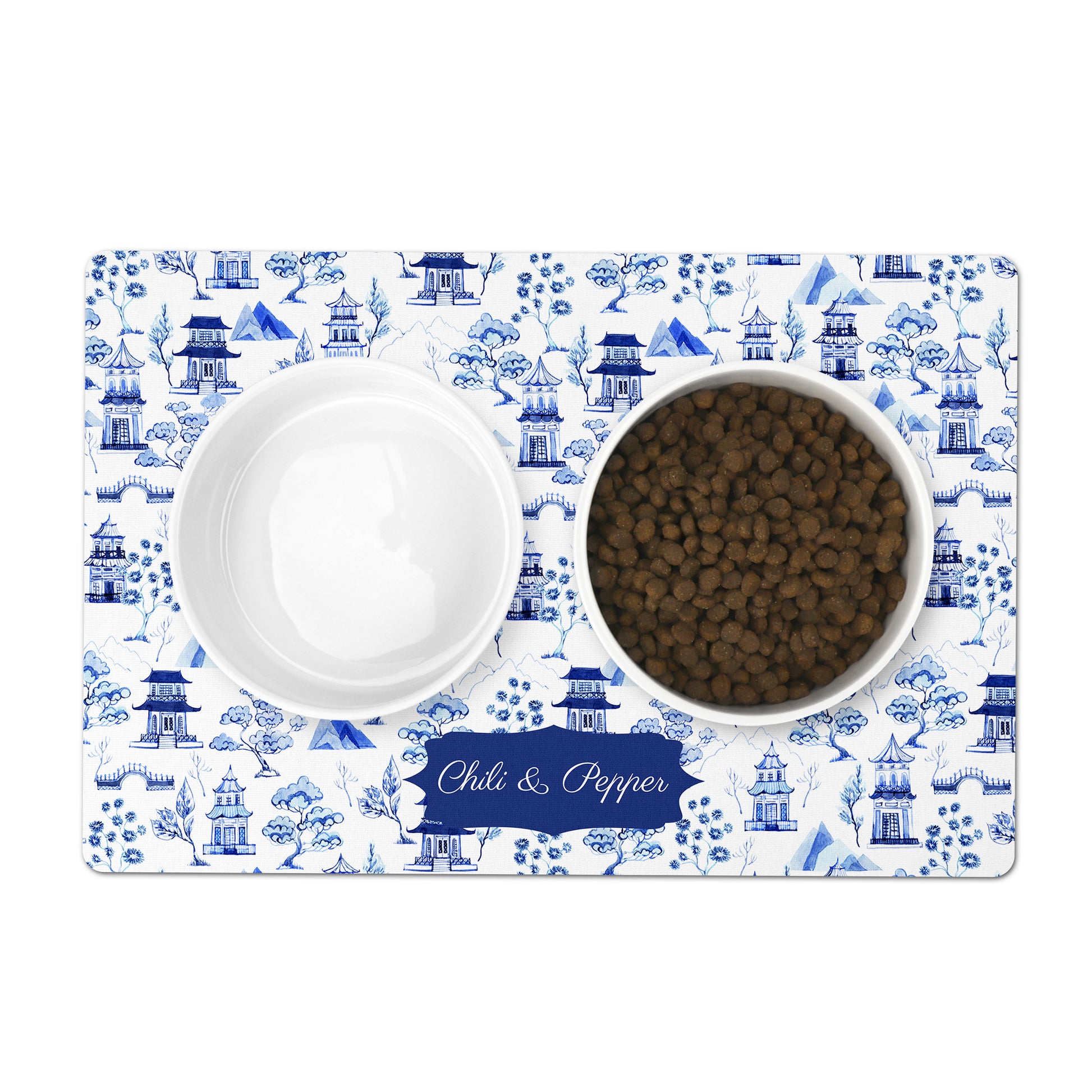 Personalized Pet Bowl Mat, Chinoiserie Toile, Blue and White
