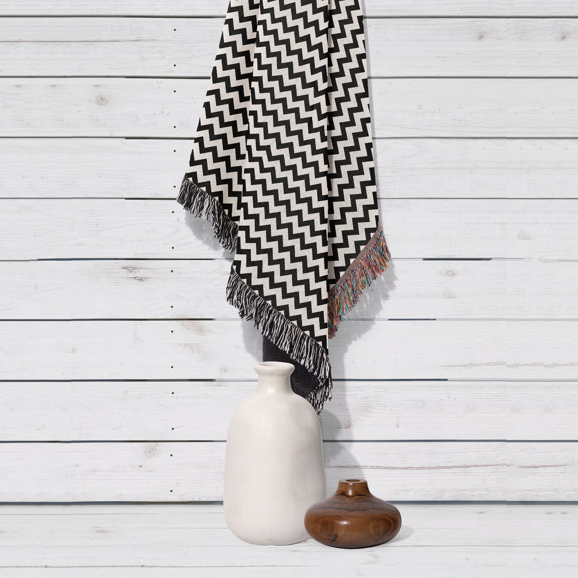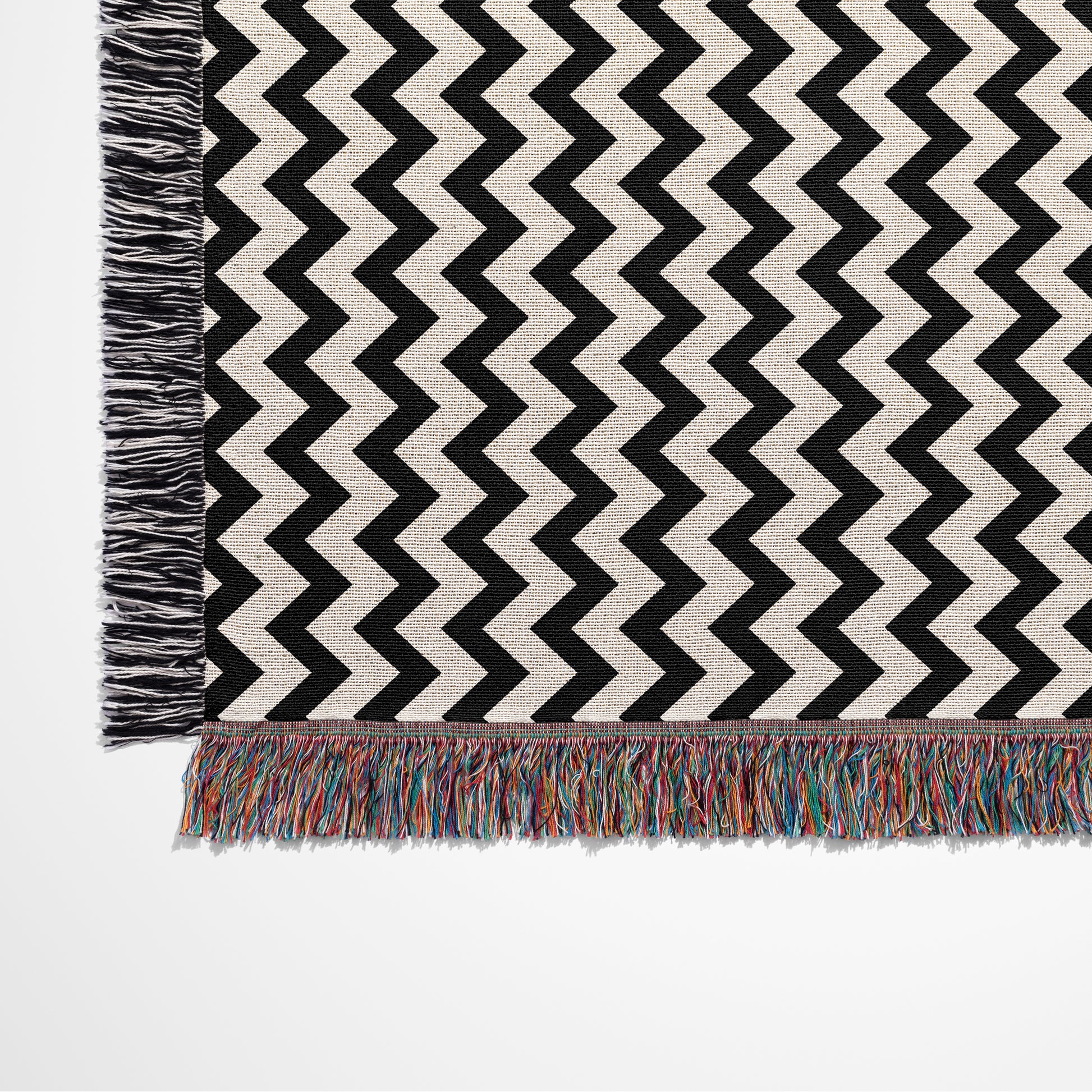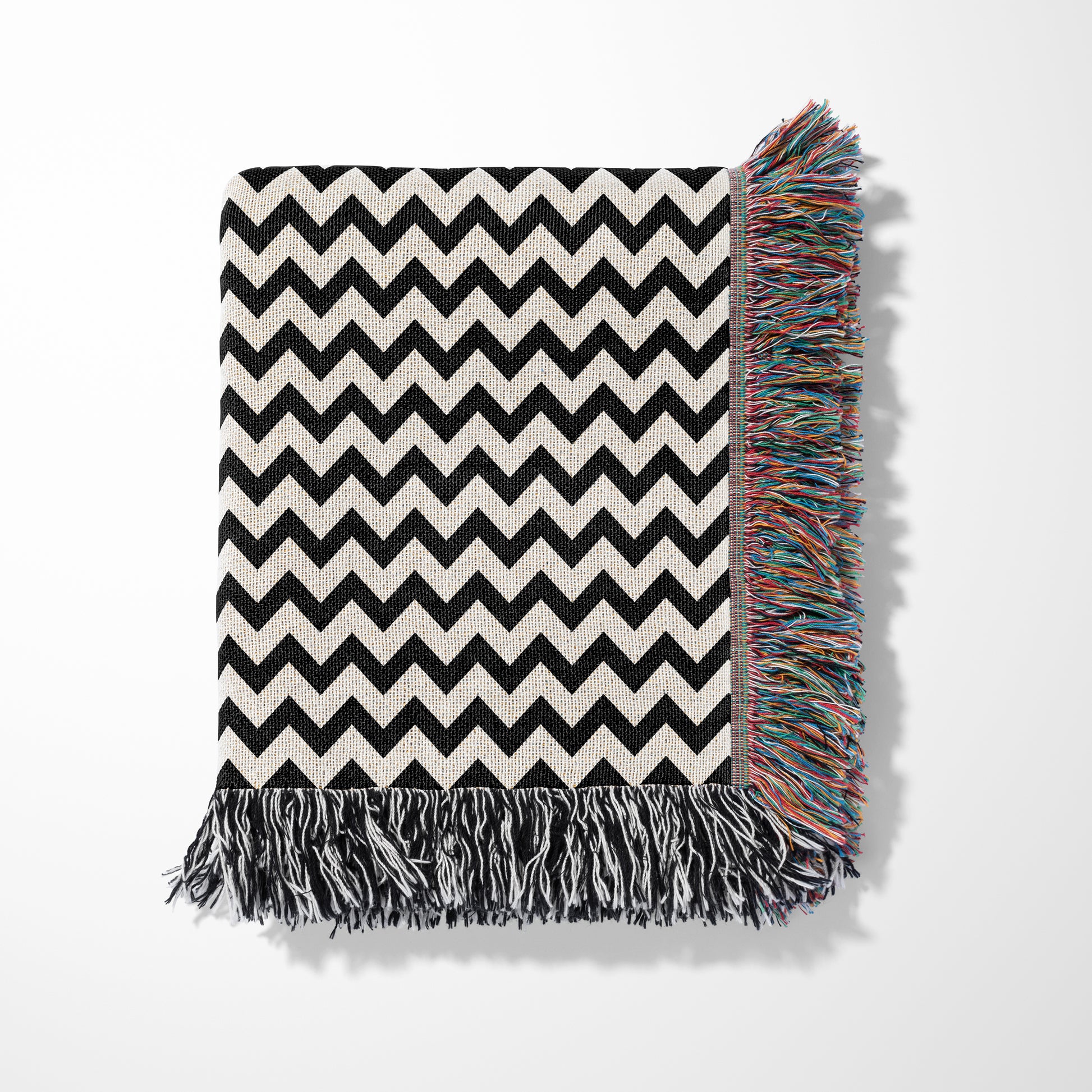 Personalized Blanket or Throw. Wrap yourself, or someone special, in the artistry of woven design with this stylish black and cream throw blanket. This classic chevron zig-zag stripe pattern is crafted through an intricate weaving process using 100% pure cotton yarn for a soft, luxurious feel. Each piece is a true work of art that brings warmth, texture and style to any room. Black/Cream and multi-color alternating 2” fringed edges elevate the look. Personalize with initials, name(s), custom text or warm wishes in round black frame at center. The perfect one-of-a-kind personalized gift.