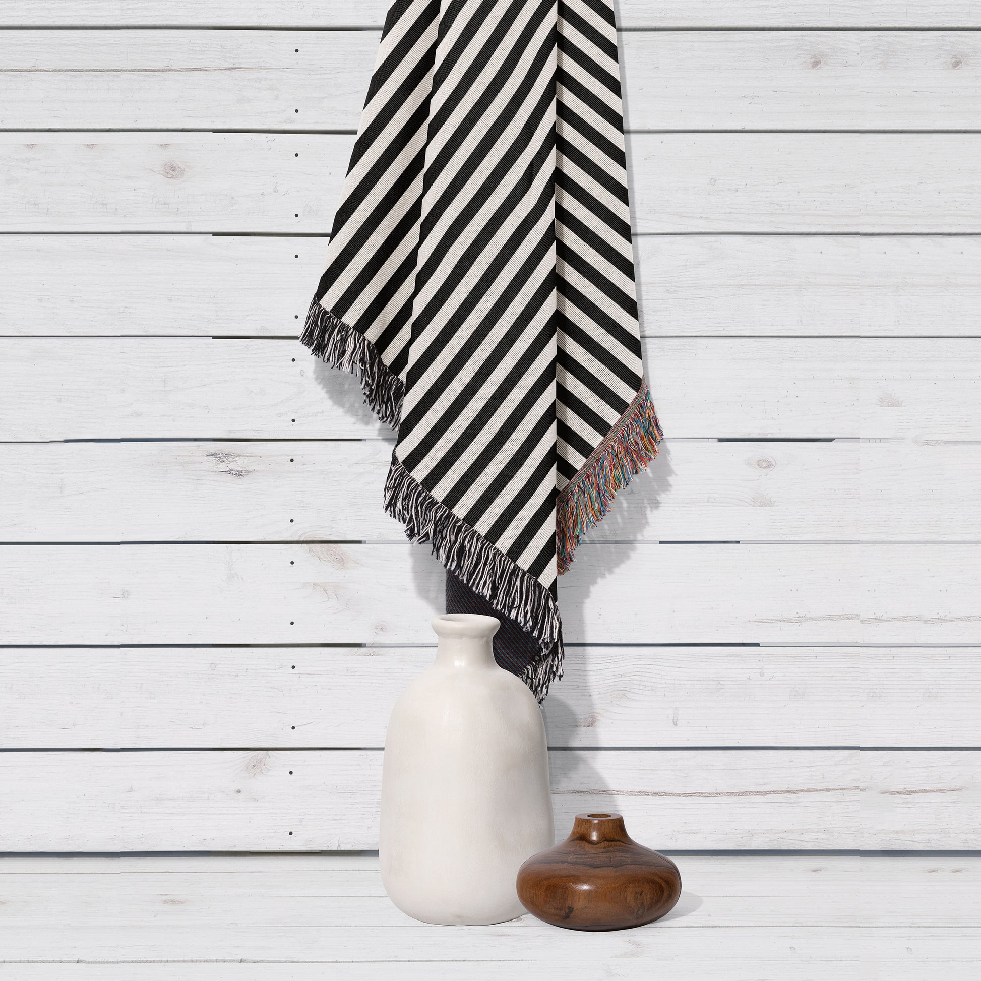 Personalized Blanket or Throw. The perfect one-of-a-kind personalized gift. Wrap yourself, or someone special, in the artistry of woven design with this stylish black and cream throw blanket. This classic canopy stripe pattern is crafted through an intricate weaving process using 100% pure cotton yarn for a soft, luxurious feel. Each piece is a true work of art that brings warmth, texture and style to any room. Black/Cream and multi-color alternating 2” fringed edges elevate the look. Personalize with initials, name(s), custom text or warm wishes in round black frame at center. The perfect one-of-a-kind personalized gift.