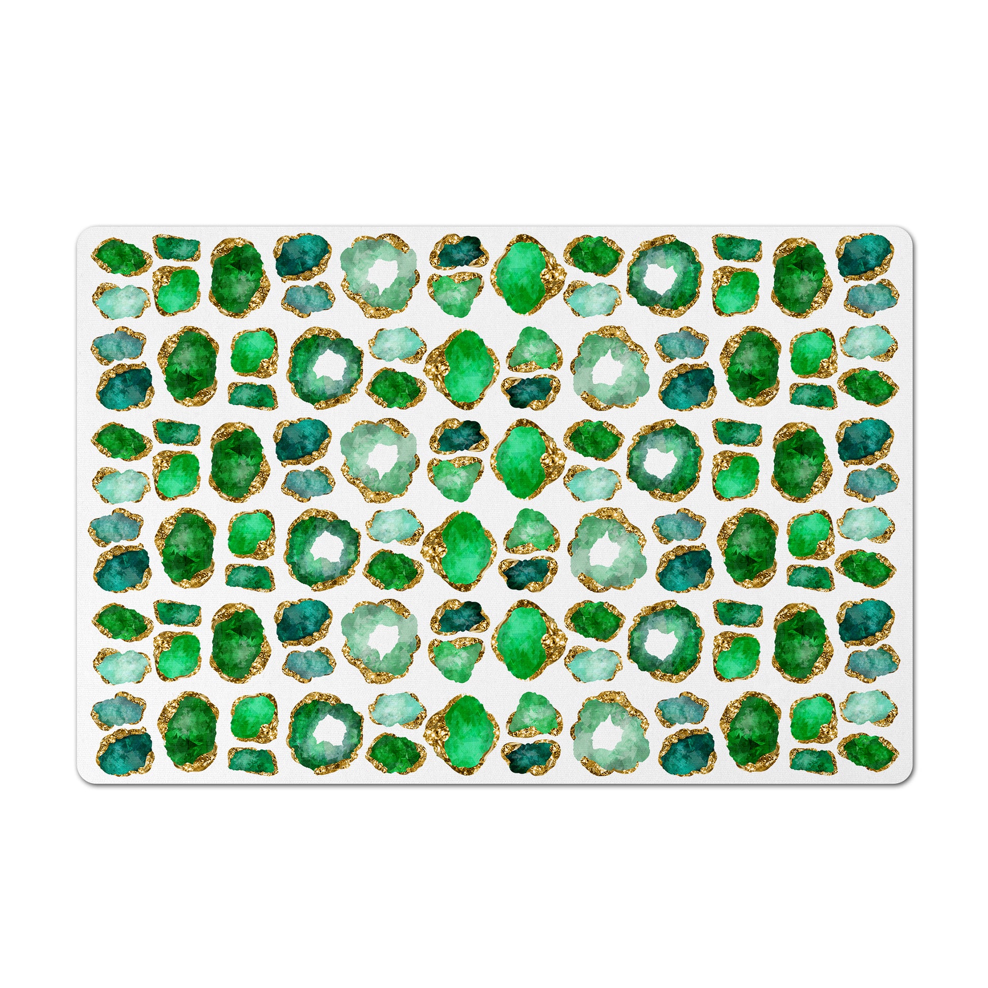 Beautiful emerald green jewel-print pet food mat. Gemstone art is printed on soft moisture-wicking polyester fabric that reverses to a non-skid black rubber backing. A lovely mat for your pet food and water bowls thoughtfully designed to enhance your home decor, making sure the pet feeding area can be in full view. 18"L x 12"W.
