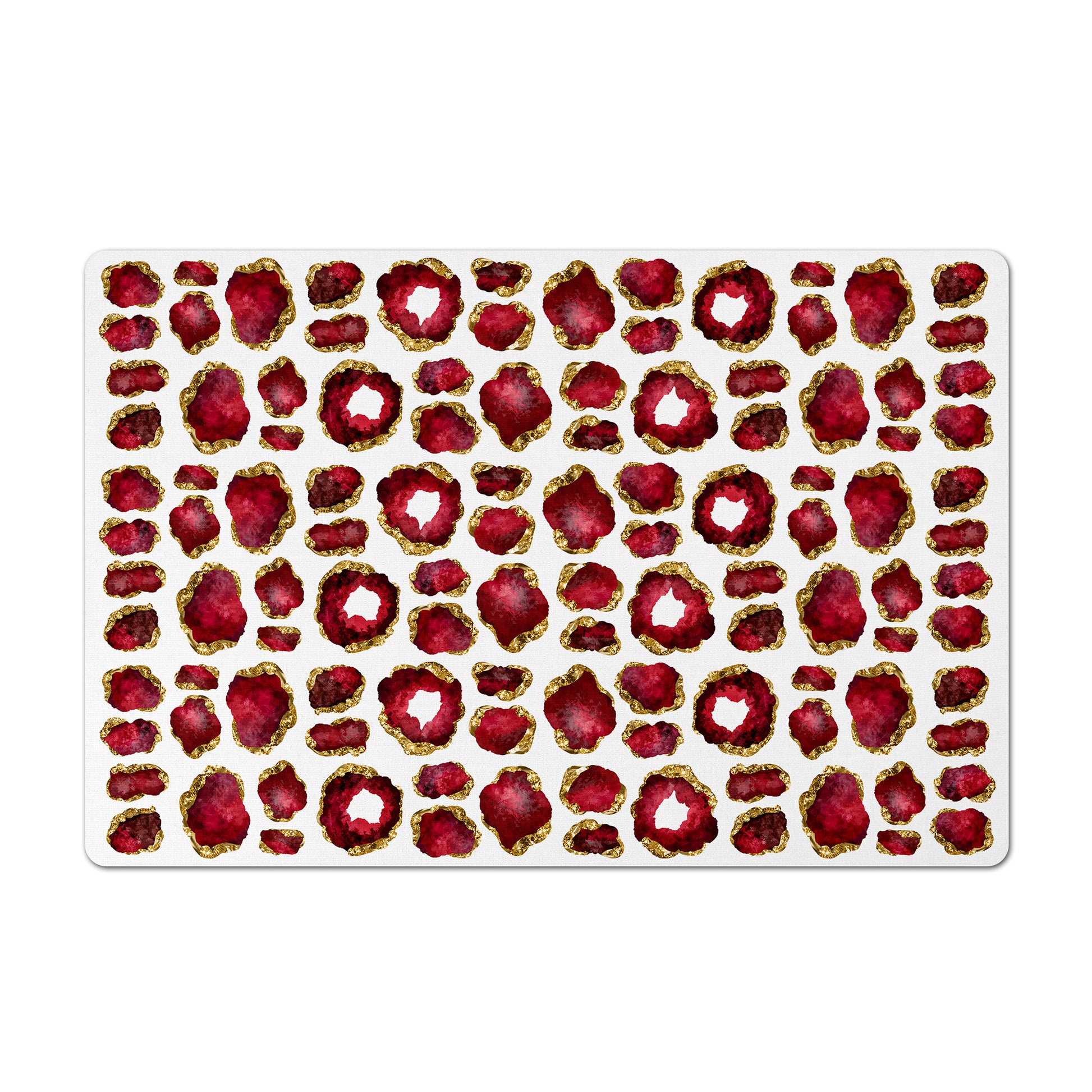 Gorgeous ruby red jewel print Pet Placemat. A lovely mat for your pet food and water bowls, thoughtfully designed to enhance your home decor, making sure pet feeding areas can be in full view. Jewel-encrusted print is watercolor-inspired hand illustrated artwork. The original art of each individual gemstone was created with a range of beautiful hues simulating the natural appearance of raw gems surrounded by a liquid-like metallic gold coloration. (Please note: These placemats feature printed artwork depicting gems; they are not actual jewels.)