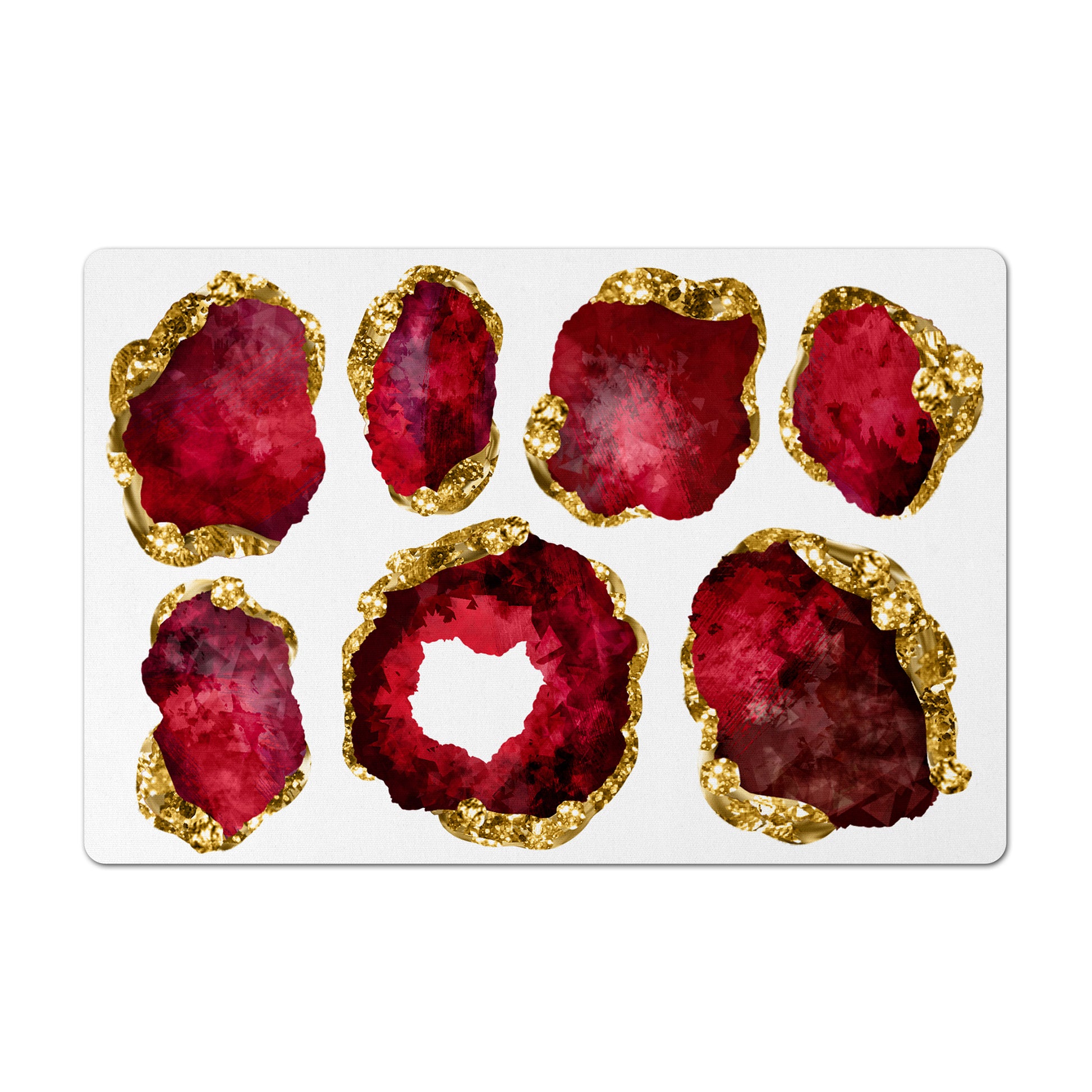 Large gemstones print is watercolor-inspired hand illustrated artwork. The original art of each individual gemstone was created with a range of beautiful hues simulating the natural appearance of raw gems surrounded by a liquid-like metallic gold coloration. (Please note: These placemats feature printed artwork depicting gems; they are not actual jewels.)