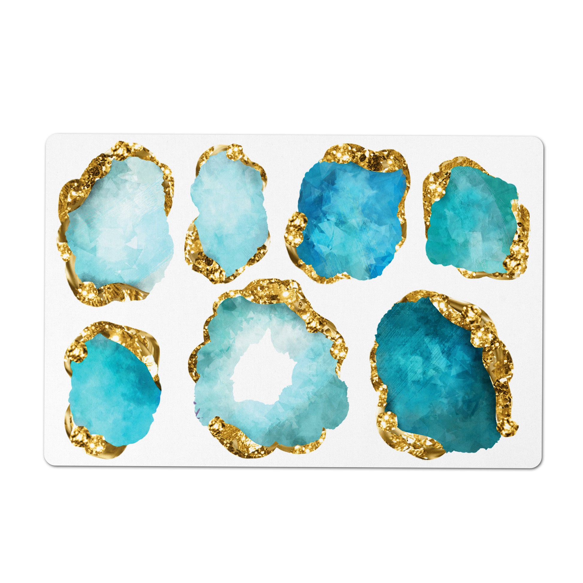 Glamorous pet food mat for food and water bowls. Luxurious aquamarine jewel print pet placemat is 18L" x 12"W. Large gemstones print is watercolor-inspired hand illustrated artwork. The original art of each individual gemstone was created with a range of beautiful hues simulating the natural appearance of raw gems surrounded by a liquid-like metallic gold coloration. (Please note: These placemats feature printed artwork depicting gems; they are not actual jewels.)