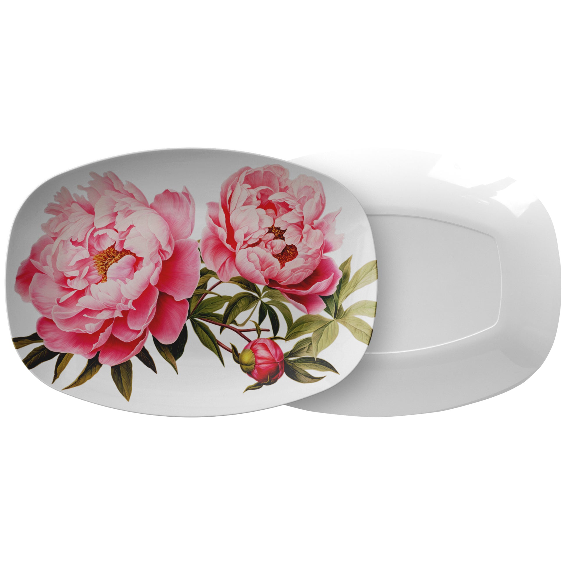 Gorgeous luxury plastic serving platter featuring luscious pink peony flowers. This platter is perfect for showcasing your culinary creations. This will be your go-to indoor-outdoor serving platter for meat and veggies off the grill, appetizers, desserts and more.