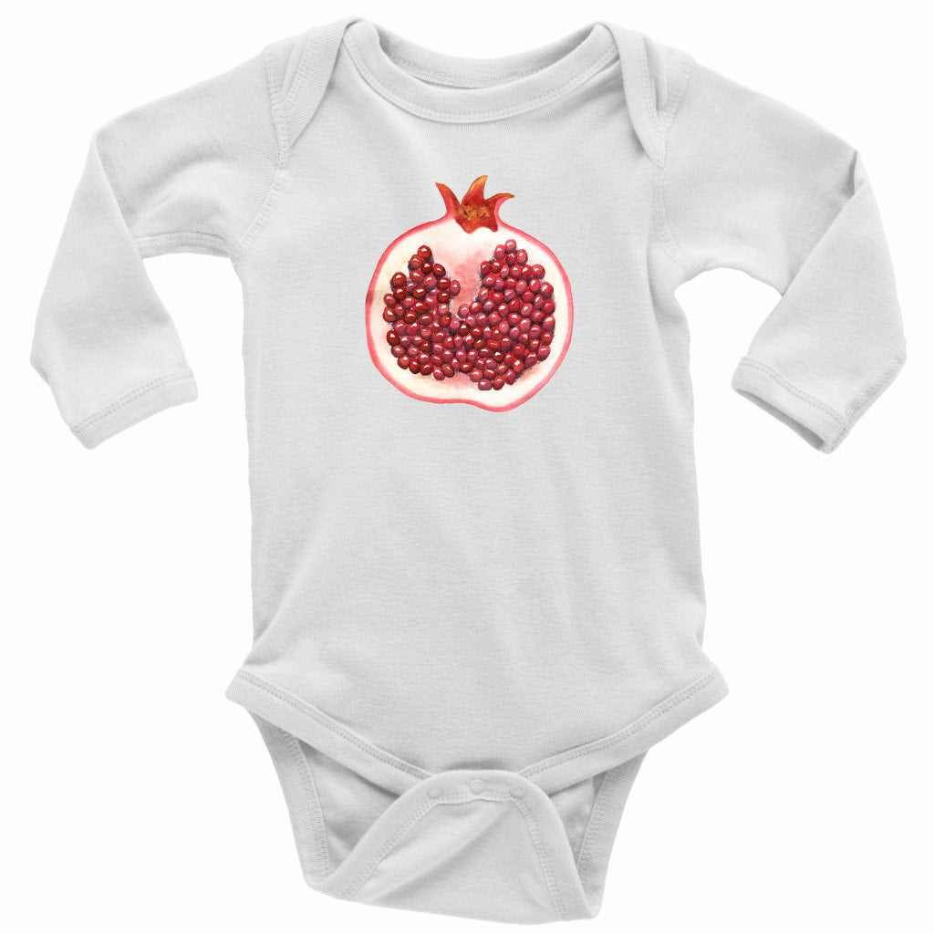 Pomegranate Print Baby Bodysuit. Adorable long sleeved white one piece with fruit print makes a cute baby gift. These bodysuits feature lap shoulders to make it easier for the many times a day that parents have to change baby’s outfit.