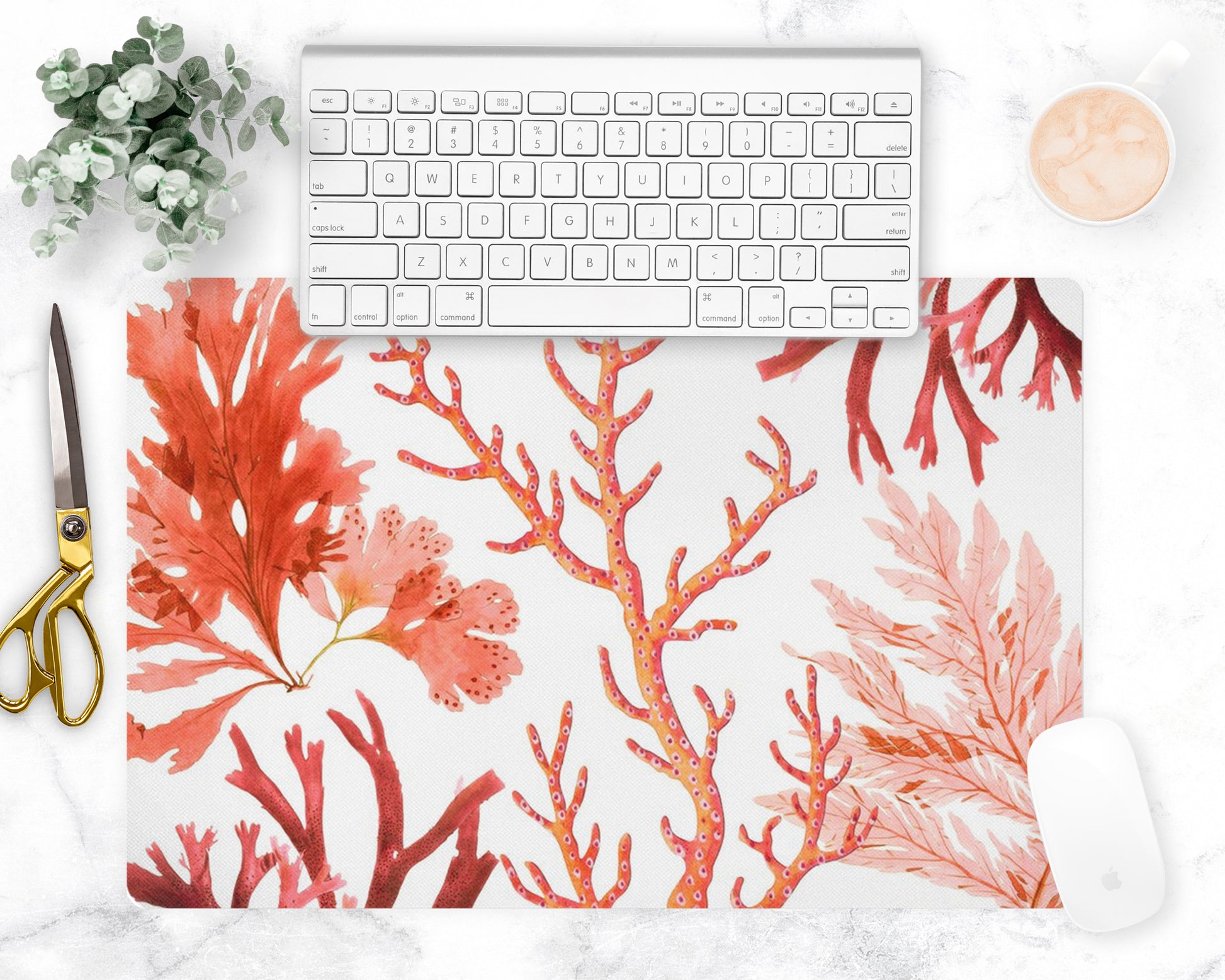 Gorgeous red, orange and pink sea coral fabric mat is a must-have to glam up and protect your kitchen counter, desk, coffee station, and bar cart! Also may be used as an oversized mouse pad or underneath indoor plants. 18"L x 12"H x 1/8"thick. Printed one at a time at our studio in New Jersey.