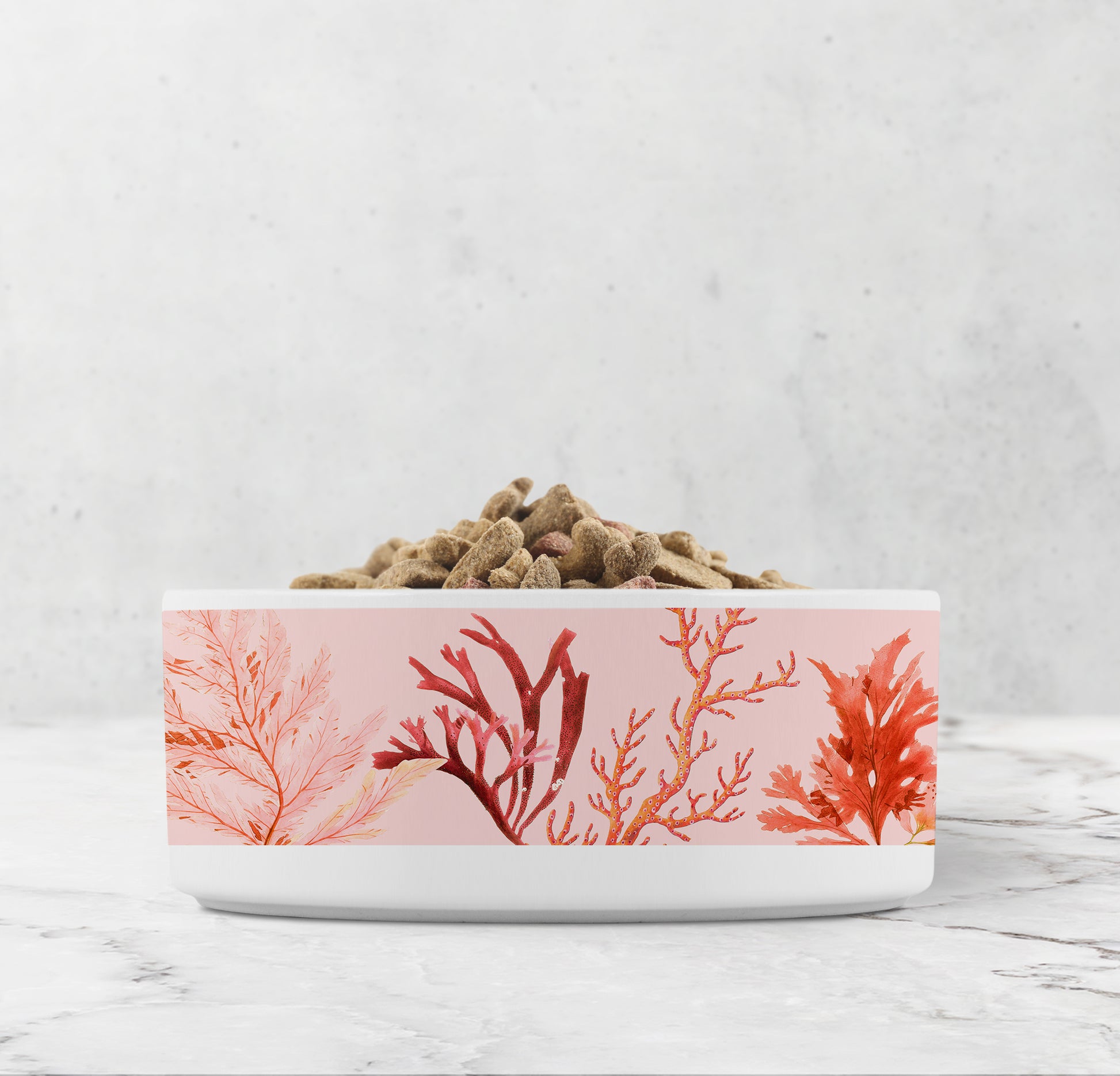 Lovely ocean coral in reds, pinks, oranges on a pale pink glossy background make this ceramic dog bowl fit in with your gorgeous home decor. This food and water bowl is designed to elevate your home decor while pampering your furry friends, combining functionality with modern design.