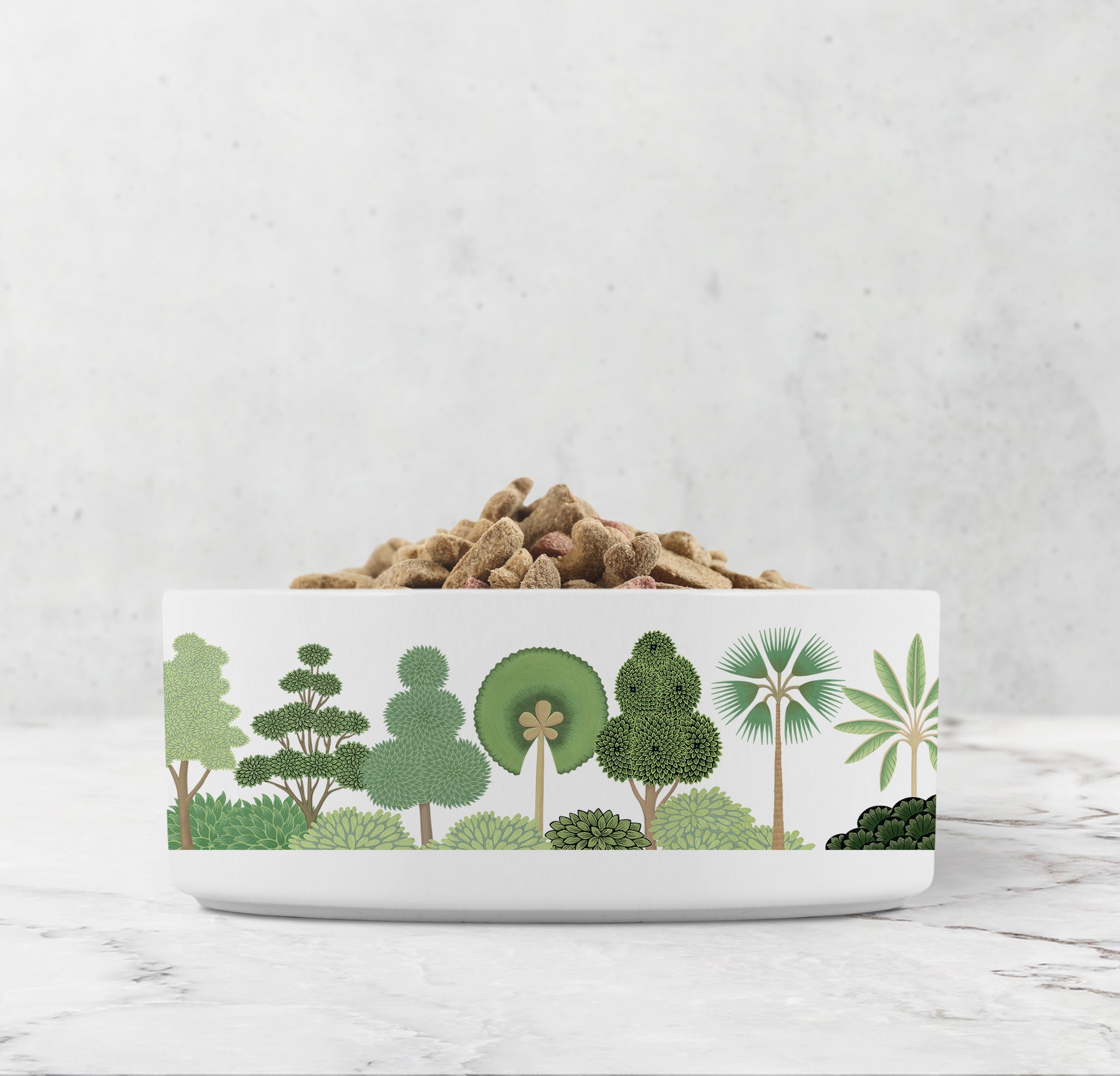 Our eye-catching Mughal Garden pet bowl is fit for royalty. This glamorous tree print is inspired by the lavish formal gardens of the Mughal Empire in India. Sophisticated and beautiful! The original artwork of this print is hand painted with gouache. White background with green trees.